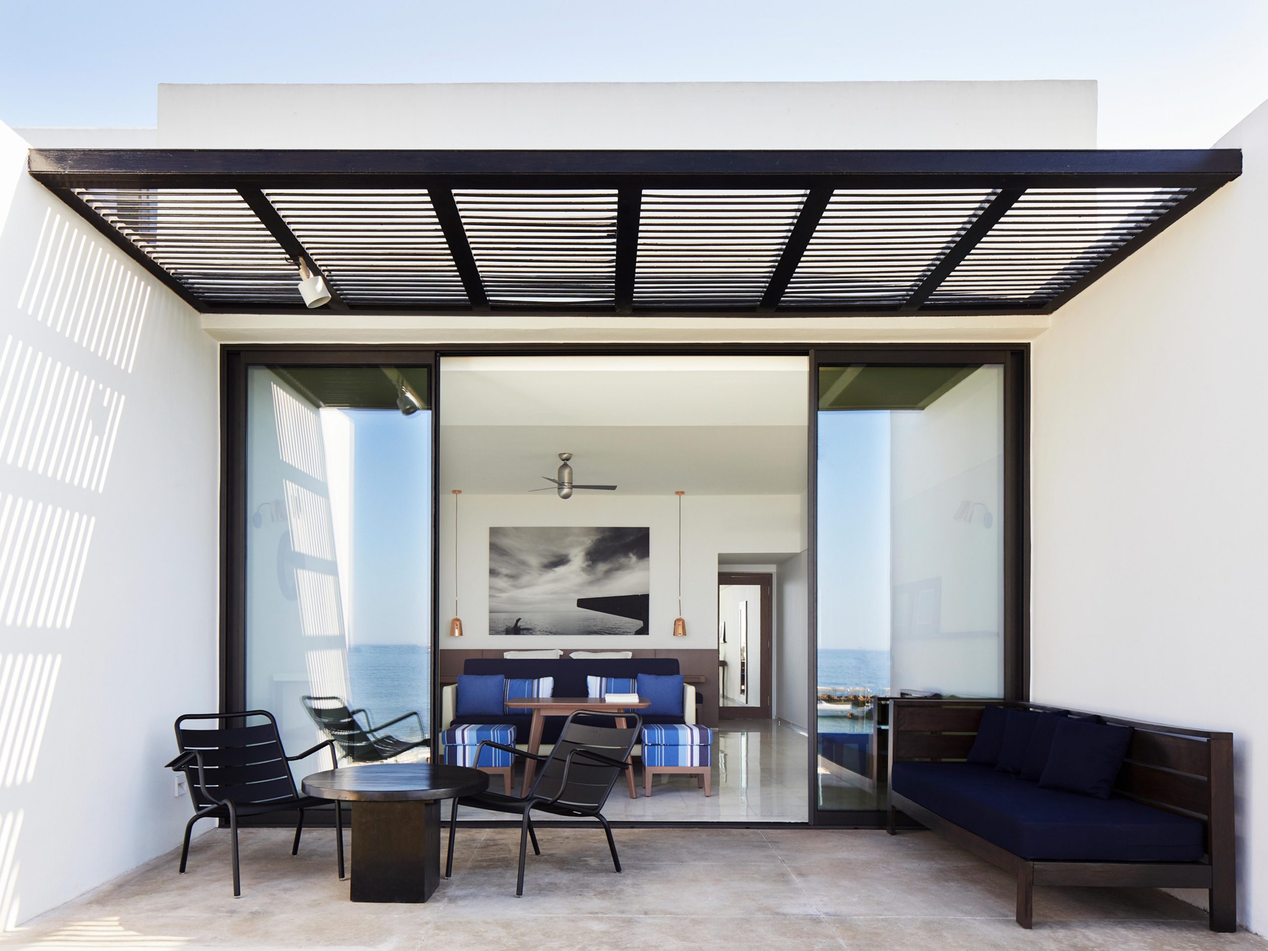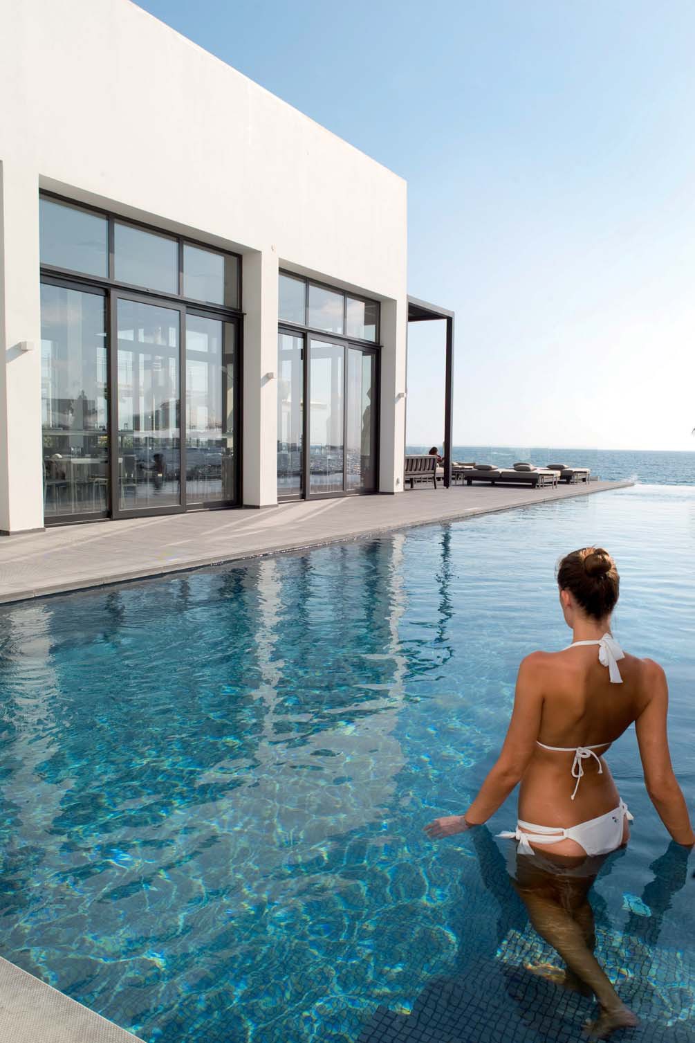 Η υπέροχη αισθητική της διακρίνεται σε όλους τους κοινόχρηστους χώρους, αλλά και σε όλα τα δωμάτια και τις σουίτες. Όλα ανανεώθηκαν με ειδικά σχεδιασμένα έπιπλα που ακολουθούν την στιλιστική υπογραφή της κορυφαίας σχεδιάστριας Joëlle Pléot. Τα έπιπλα είναι σχεδιασμένα με λεπτές, καλαίσθητες γραμμές και έρχονται σε συνδυασμούς του λευκού με διάφορες αποχρώσεις του μπλε, εμπνευσμένες από την Μεσόγειο θάλασσα που αγκαλιάζει το νησί.