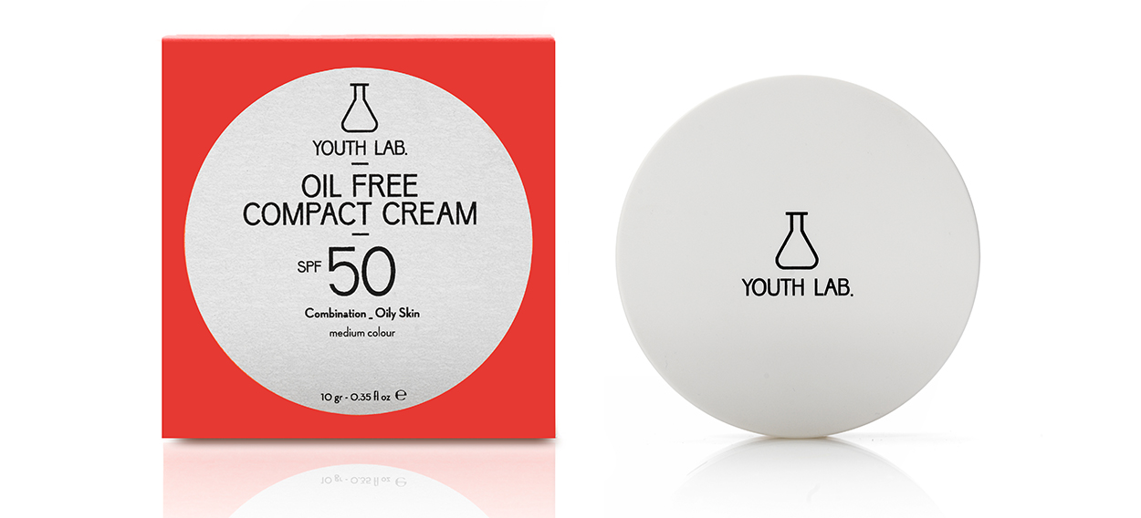 ♥ Η Oil Free Compact Cream με SPF 50 της Youth Lab, είναι αφιερωμένη σε σένα που έχεις μικτό ή λιπαρό δέρμα. Η μη λιπαρή φόρμουλα (με φυσικά συστατικά) αυτού του compact make up, προσφέρει ισχυρή αντηλιακή προστασία από τη UVA, UVB και την IR ακτινοβολία. Παράλληλα, προσφέρει ματ αποτέλεσμα, ελαχιστοποιεί τους πόρους του δέρματος, και ομαλοποιεί την υφή της επιδερμίδας σου, αφήνοντας το με μια λεία, μεταξένια αίσθηση. Το εφαρμόζεις 30 λεπτά πριν βγεις στον ήλιο, απευθείας σε πρόσωπο, λαιμό και ντεκολτέ, καλύπτοντας προσεκτικά όλες τις περιοχές που εκτίθενται. Θα τη βρεις σε τρεις αποχρώσεις (light, medium & dark), σε επιλεγμένα φαρμακεία.