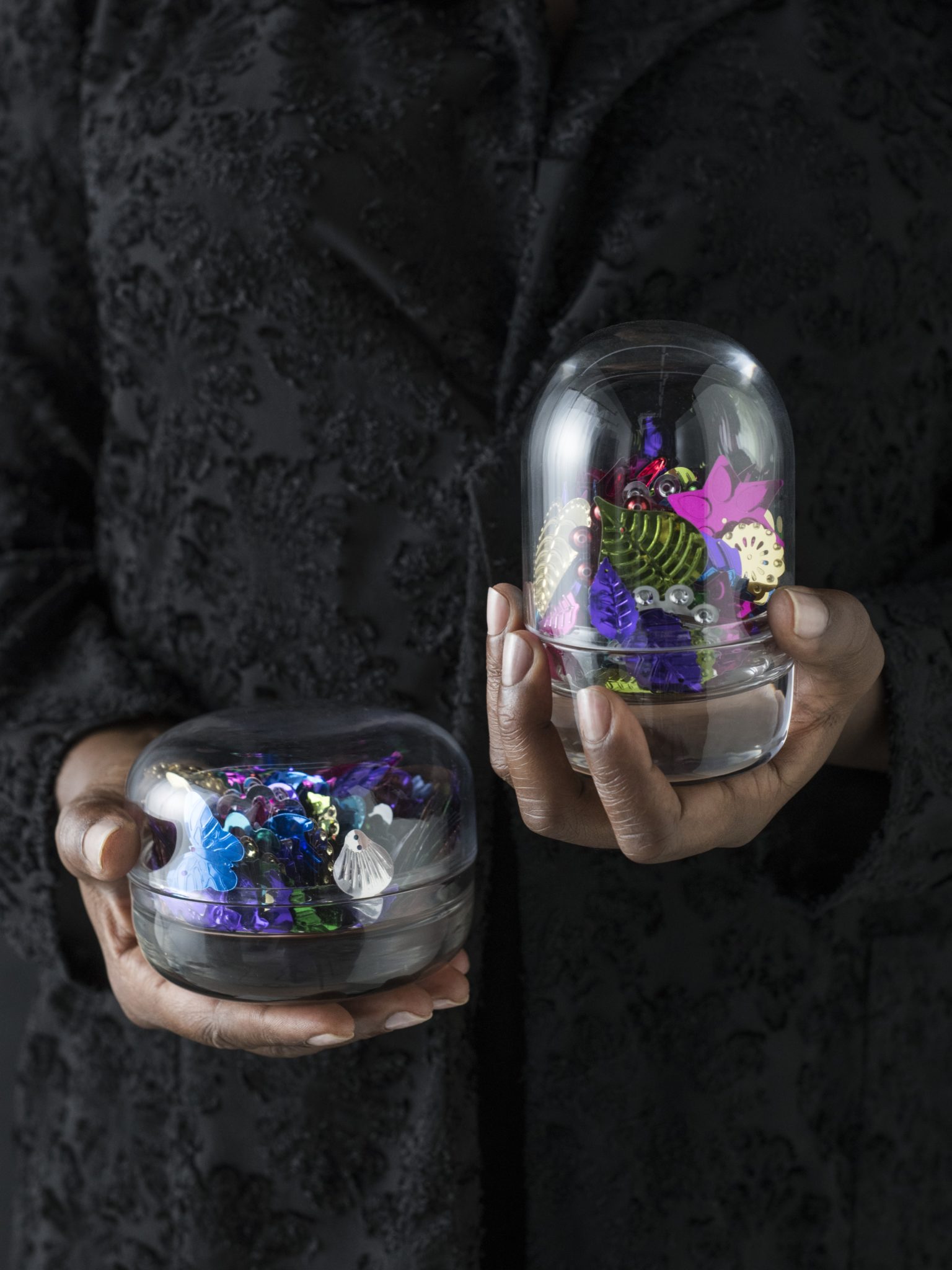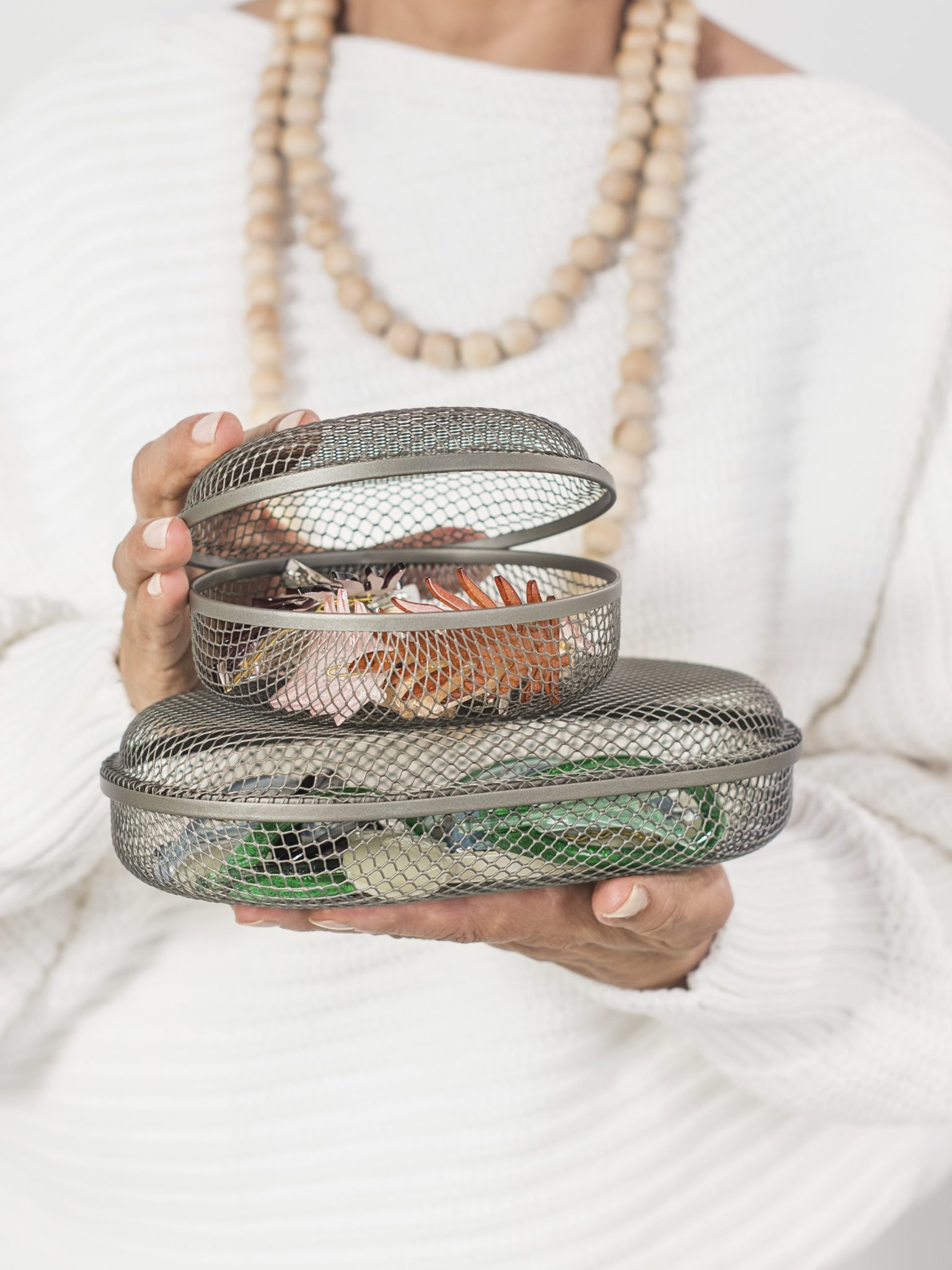 Η ομάδα σχεδιαστών Truly Truly, Joel και Kate Booy μελέτησαν τις ιδιότητες του γυαλιού και φτιάχνουν προϊόντα που αναδεικνύουν τα αντικείμενά σας χωρίς τη χρήση του. «Τα κουτιά με καπάκι SAMMANHANG φτιάχνονται από πλέγμα, ένα υλικό που δείχνει εν μέρει το περιεχόμενο χωρίς να το κρύβει». Ένα ακόμα πλεονέκτημα του πλέγματος είναι ότι παίρνει μορφή πολύ εύκολα. Η Kate και ο Joel ένωσαν δύο στρώσεις, δημιουργώντας συναρπαστικά σχέδια. Για να αναδείξετε το περιεχόμενο, απλά σηκώνετε το καπάκι! «Μεγάλη λειτουργικότητα με τόσο μικρή ποσότητα υλικού. Είναι ο τέλειος συνδυασμός», εξηγούν οι ίδιοι.