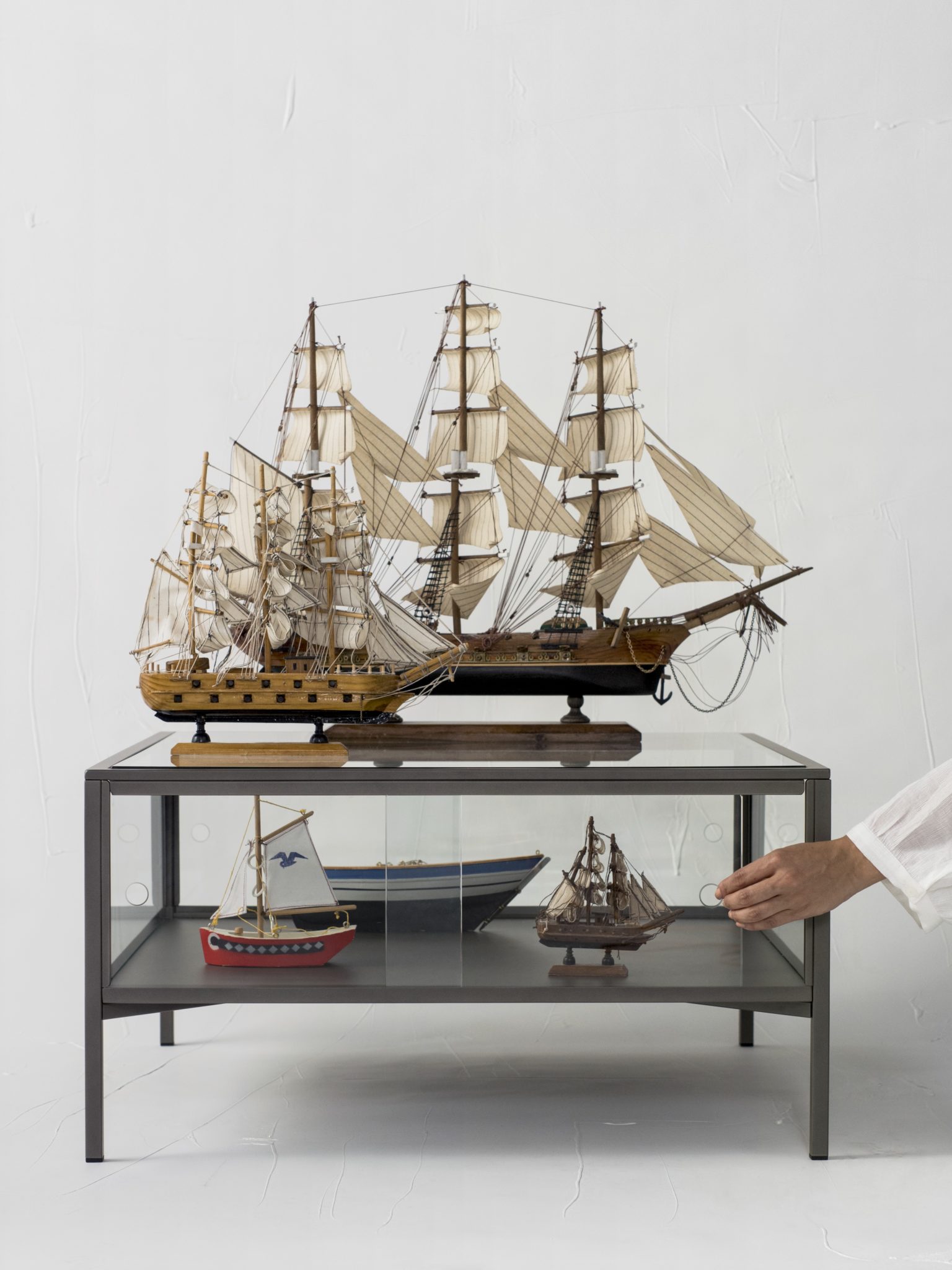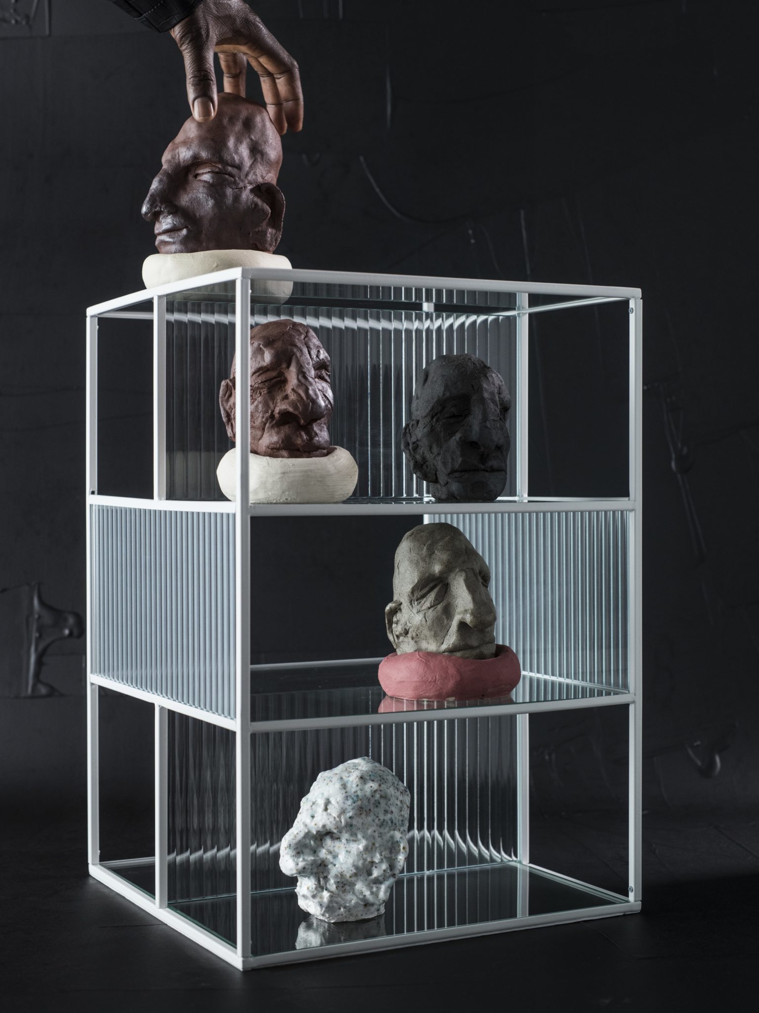 Το σχεδιαστικό δίδυμο χρησιμοποίησε και γυαλί, για να κρύψει ή να αναδείξει διάφορα εκθέματα. «Εμπνευστήκαμε από το γυαλί και τις αντανακλαστικές του ιδιότητες με το φως. Εστιάσαμε στην αντίθεση του να δείχνεις και ταυτόχρονα να κρύβεις αντικείμενα», εξηγούν. Η μισή πλευρά του πιο κάτω ραφιού είναι κατασκευασμένη από ραβδωτό γυαλί και η άλλη μισή από καθαρό γυαλί, για να το γυρνάτε ανάλογα με τις προτιμήσεις σας. Έτσι, θα παρουσιάζετε ή και θα κρύβετε τα εκθέματά σας.