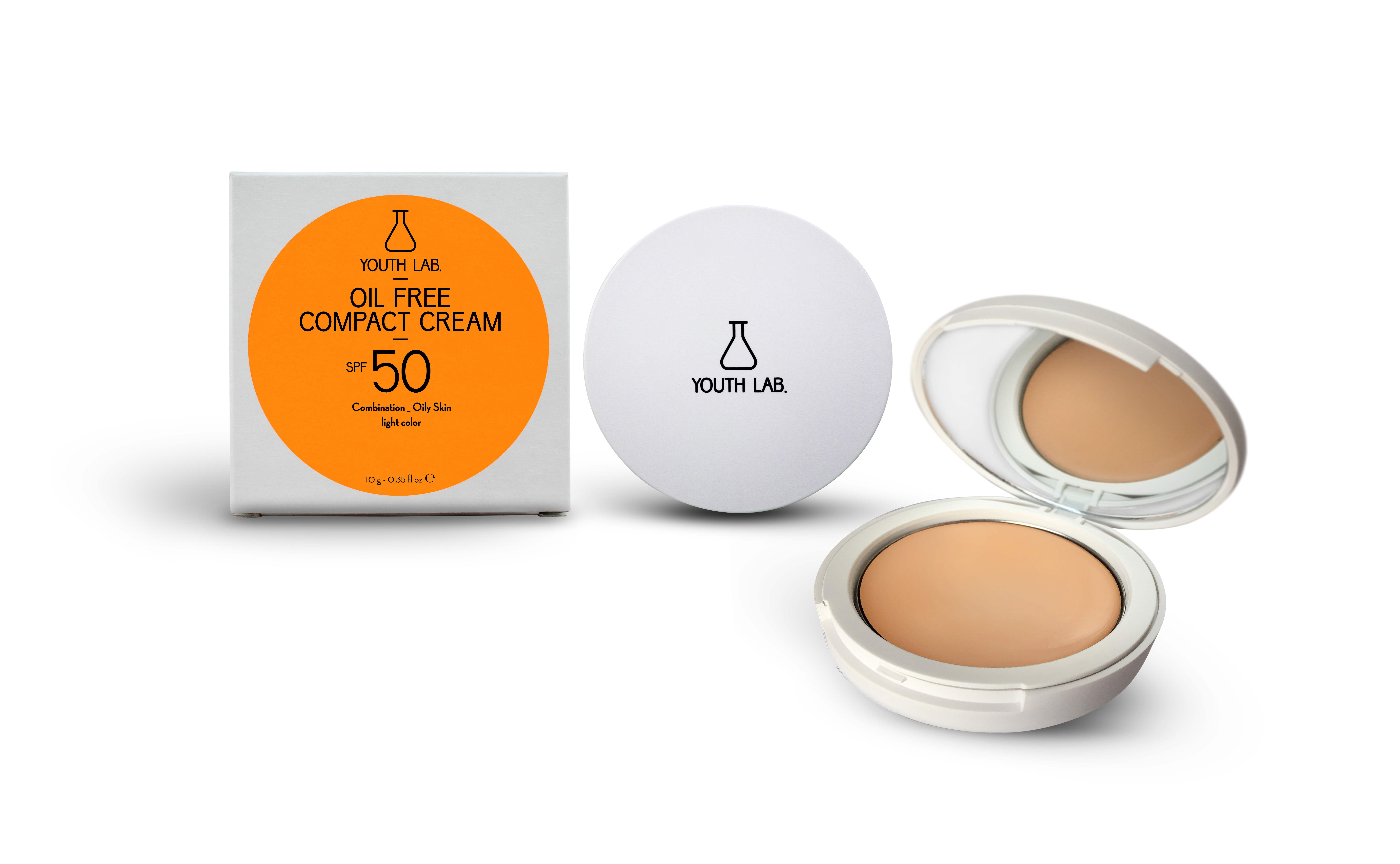 Oil Free Compact Cream SPF 50, Youth Lab, compact make-up για ισχυρή αντηλιακή προστασία από τη UVA και την UVB ηλιακή ακτινοβολία. Η μη λιπαρή σύνθεσή του προσαρμόζεται στο χρωματικό τόνο της επιδερμίδας, ενώ ελαχιστοποιεί την όψη των πόρων του δέρματος, χαρίζοντας ματ αποτέλεσμα και ομοιόμορφη όψη που παραμένει σταθερή και αναλλοίωτη για ώρες. Σε πρακτική συσκευασία με σφουγγαράκι εφαρμογής και καθρέπτη. Δερματολογικά ελεγμένο, μη φαγεσωρογόνο, χωρίς parabens. Στα φαρμακεία.