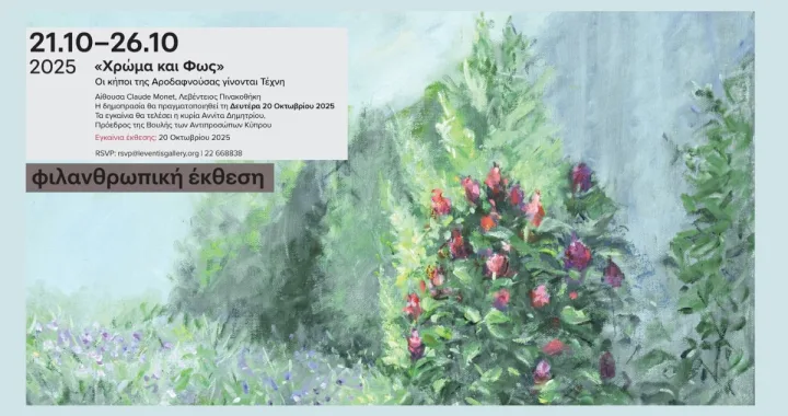 Ο Αντικαρκινικός Σύνδεσμος Κύπρου και η Λεβέντειος Πινακοθήκη παρουσιάζουν την έκθεση «Χρώμα και Φως: Οι κήποι της Αροδαφνούσας γίνονται Τέχνη», μια ξεχωριστή πρωτοβουλία που ενώνει τον κόσμο της τέχνης με αυτόν της προσφοράς. Μάθε τώρα όλες τις ενδιαφέρουσες λεπτομέρειες για την έκθεση, και φρόντισε να μην την χάσεις… γιατί έχει