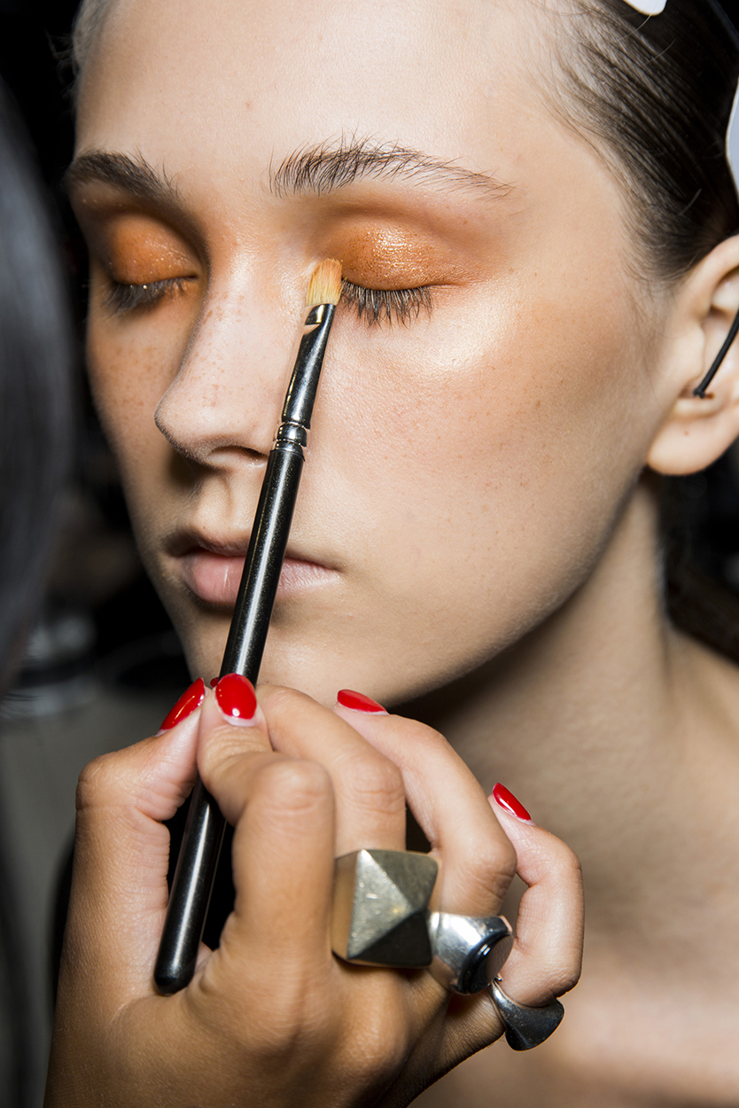 Ακόμη μια δυο μικρολεπτομέρειες: Ορισμένοι make up designers επέλεξαν να προσθέσουν στο μακιγιάζ των μοντέλων μια peachy σκιά στο κινητό βλέφαρο, μερικές διακριτικές γυαλάδες κι ένα nude κραγιόν σε κρεμώδη υφή. Ο συνδυασμός της επιτυχίας!