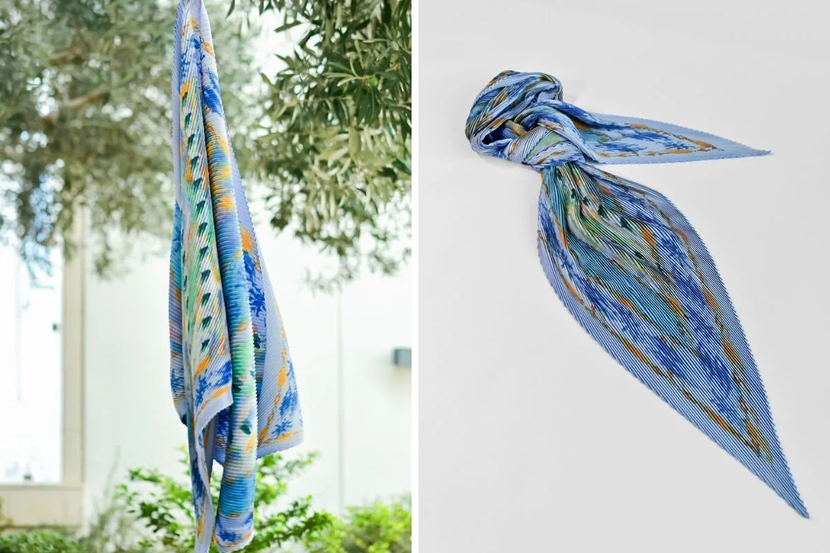 ♦ Για κάτι πιο “ζεστό” και wearable, επίλεξε το φουλάρι “Κάνθος” της Αλεξάνδρας Τσουκαλά. Είναι εμπνευσμένο από τον πίνακα του Τηλεμάχου Κάνθου (1910-1993), “Ρεματιά ΙΙ – Πρωινό”, 1991, από την Κυπριακή Συλλογή της Λεβεντείου Πινακοθήκης. Η ρεματιά του αγαπημένου Κύπριου καλλιτέχνη μεταφέρθηκε σε σατέν ύφασμα, με πτυχώσεις που δημιουργούν νέα σχήματα και κίνηση. Διατηρήθηκαν μικρές πινελιές από την πρωτότυπη ελαιογραφία του ζωγράφου, συνδυάζοντας την τέχνη με τη μόδα. Απόκτησε το και φόρεσέ το… Είναι σαν να χαρίζεις στον εαυτό σου ένα μικρό έργο τέχνης. Τιμή: 70,00€. Μπορείς να το αποκτήσεις και διαδικτυακά εδώ.