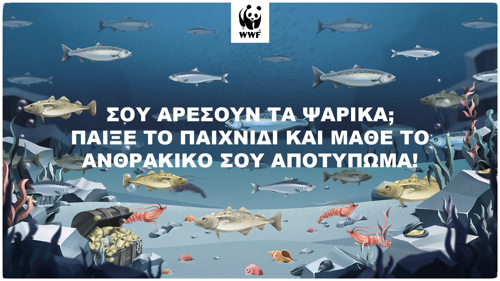 Τα ψάρια και τα θαλασσινά πάντοτε είχαν ιδιαίτερη θέση στο τραπέζι μας.Τι αντίκτυπο όμως έχουν στο περιβάλλον οι καταναλωτικές μας επιλογές; Γιατί ορισμένες επιλογές μας σε ψαρικά κάνουν καλό στις θάλασσές μας, ενώ κάποιες άλλες επιδεινώνουν ακόμα και την κλιματική κρίση; Απαντήσεις σε αυτά τα ερωτήματα δίνει το νέο διαδικτυακό παιχνίδι του WWF (https://www.wwf-finprint.org/gr) που μέσα από ένα εικονικό υποθαλάσσιο ταξίδι ενημερώνει τους καταναλωτές για τα στάδια της παραγωγής, αλιείας και μεταφοράς ψαρικών και τις επιπτώσεις τους για το κλίμα.