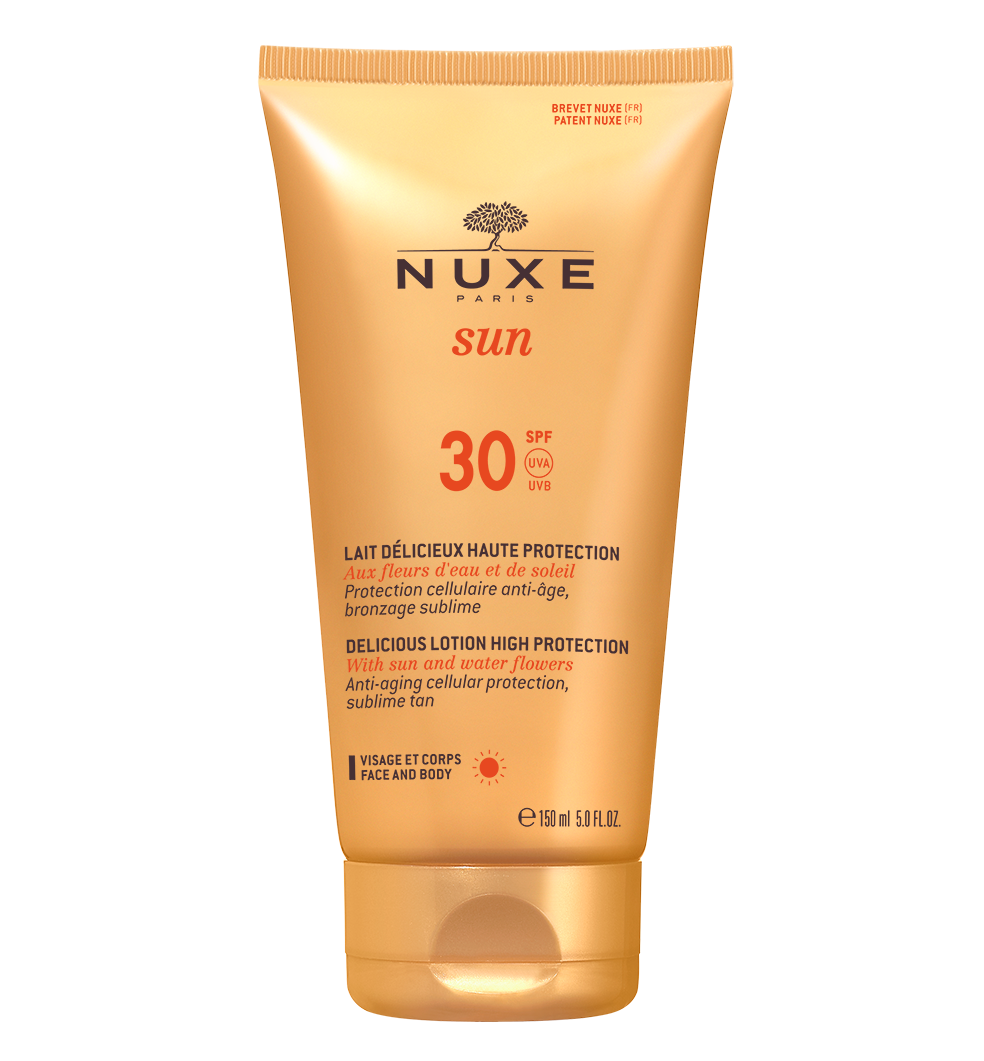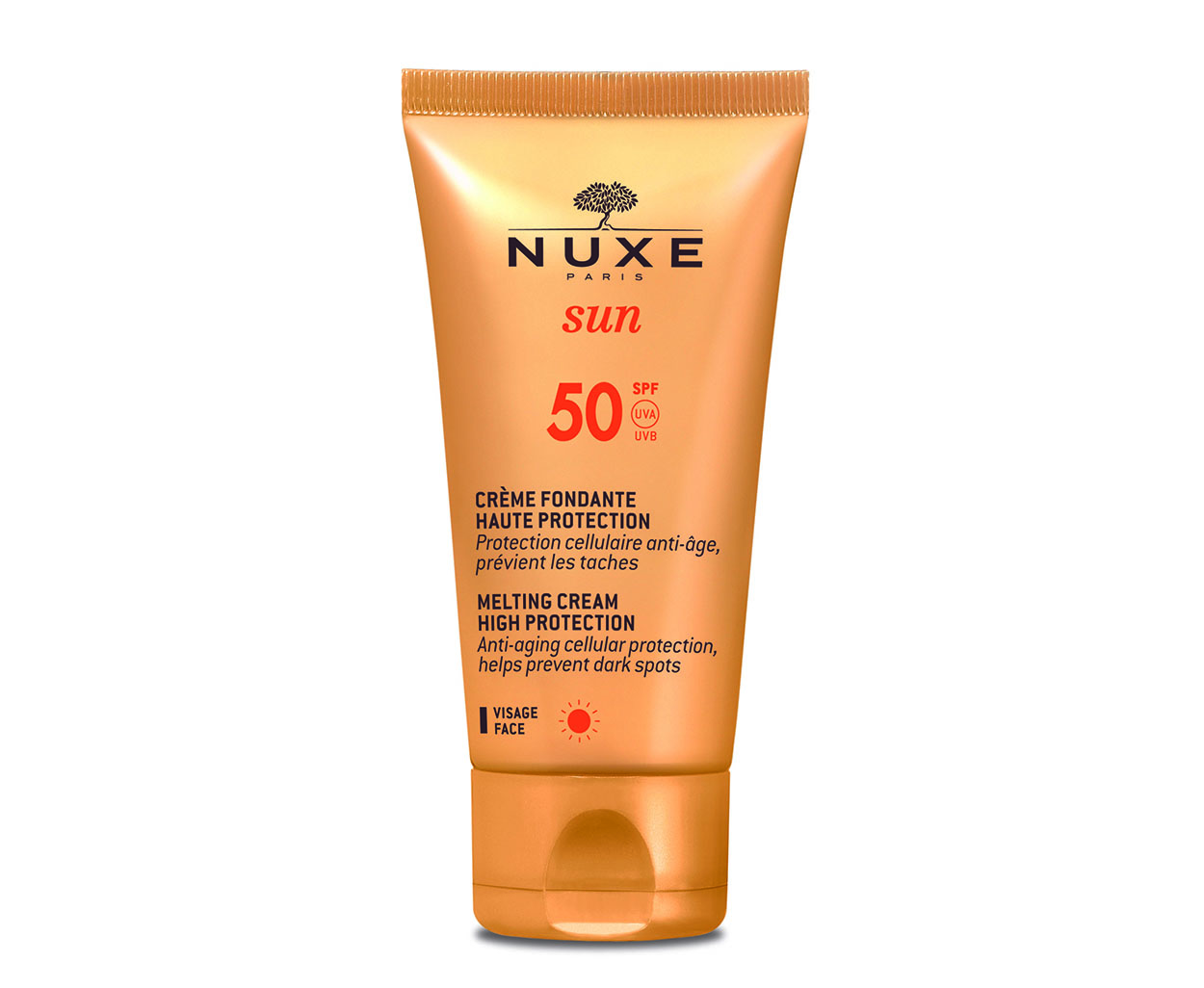 SUN CRÈME FONDANTE HAUTE PROTECTION SPF50: Το πρόσωπο σας πρέπει να το φροντίζετε, ιδιαίτερα την καλοκαιρινή περίοδο. Το γαλάκτωμα προσώπου της Nuxe με δείκτη προστασίας SPF 50 παρέχει όλα όσα χρειάζεστε! Προστατεύει τα κύτταρα του δέρματος από τις υπεριώδεις ακτίνες UVA – UVB και την πρόωρη γήρανση, βοηθά στην καταπολέμηση της εμφάνισης των κηλίδων του δέρματος που προκαλούνται από την έκθεση στον ήλιο, ενυδατώνει έντονα, ηρεμεί το δέρμα και δίνει ένα ωραίο ομοιόμορφο μαύρισμα, χάρη στο το νερό υάκινθου και ηλιοτρόπιου που περιέχει. Και το πιο ενδιαφέρον; Είναι αδιάβροχο, μη κολλώδες, με μη λιπαρή υφή, που απλώνεται στο δέρμα για να αφήσει ένα γλυκό άρωμα χωρίς λευκά υπολείματα.