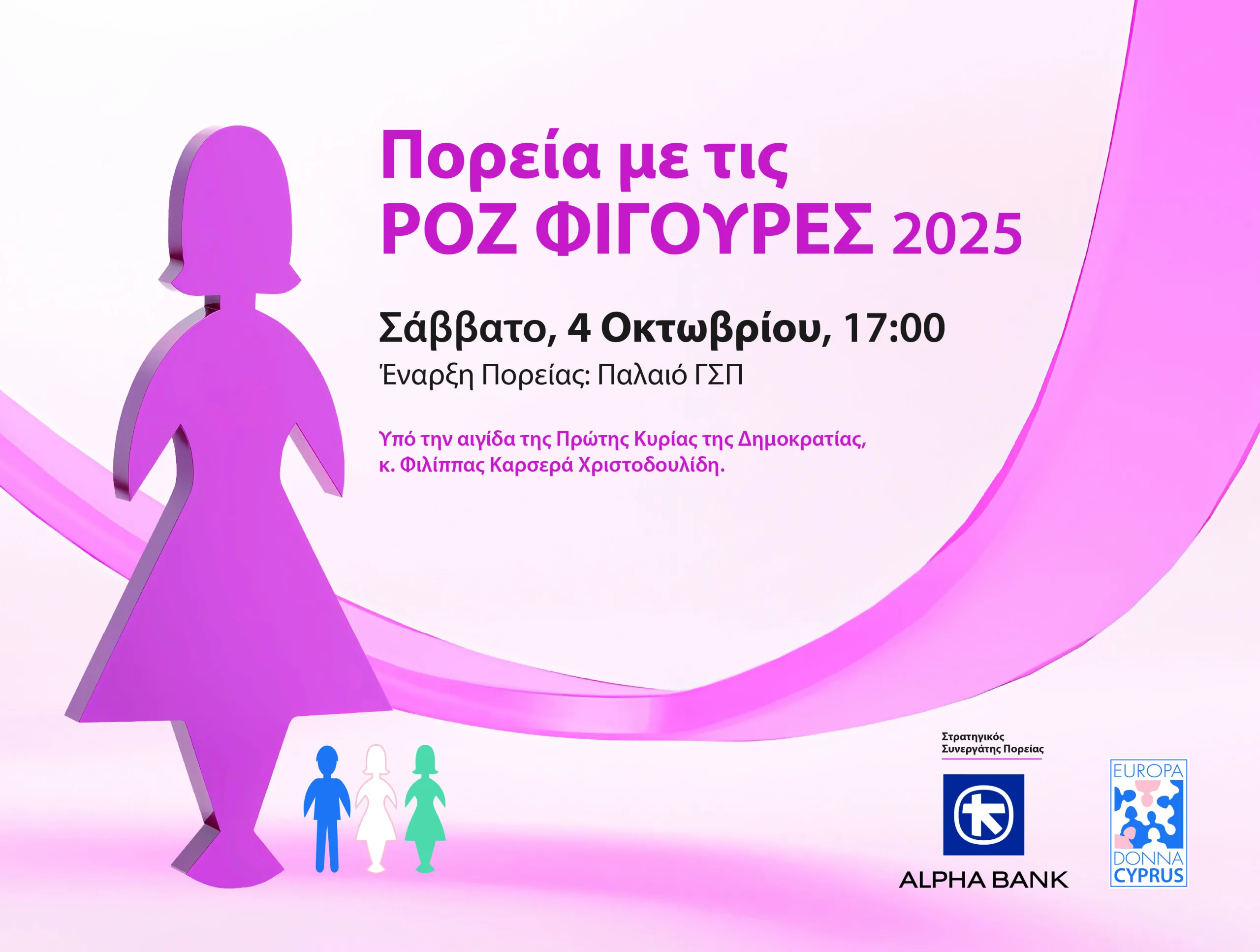 Το Σάββατο 4 Οκτωβρίου, θα ενώσουμε τις φωνές μας και θα περπατήσουμε για όλα όσα άλλαξαν και για όλα όσα χρειάζεται να γίνουν, για την ενημέρωση, την πρόληψη, την έγκαιρη διάγνωση και την εξειδίκευση στον καρκίνο του μαστού, συμμετέχοντας στην Πορεία με τις Ροζ Φιγούρες, που αποτελεί τη μεγαλύτερη εκδήλωση συμπαράστασης ασθενών στην Κύπρο.Η πορεία θα ξεκινήσει στις 5 το απόγευμα, με σημείο εκκίνησης τo Παλαιό ΓΣΠ στη Λευκωσία και θα κατευθυνθεί από εκεί στο κτίριο της Αlpha Bank Κύπρου, Στυλιανού Λένα, που από φέτος είναι ο Στρατηγικός Συνεργάτης της Πορείας. Εκεί θα τοποθετηθούν 849 φιγούρες που συμβολίζουν τα νέα περιστατικά καρκίνου του μαστού σε γυναίκες, που καταγράφηκαν το 2024 στην Κύπρο, 9 μπλε φιγούρες που συμβολίζουν τα νέα περιστατικά καρκίνου του μαστού σε άντρες και 273 τιρκουάζ φιγούρες για τα νέα περιστατικά γυναικολογικού καρκίνου. Θα τοποθετηθούν επίσης και 285 λευκές φιγούρες που συμβολίζουν τα άτομα που δυστυχώς έχουμε χάσει κατά το 2024.