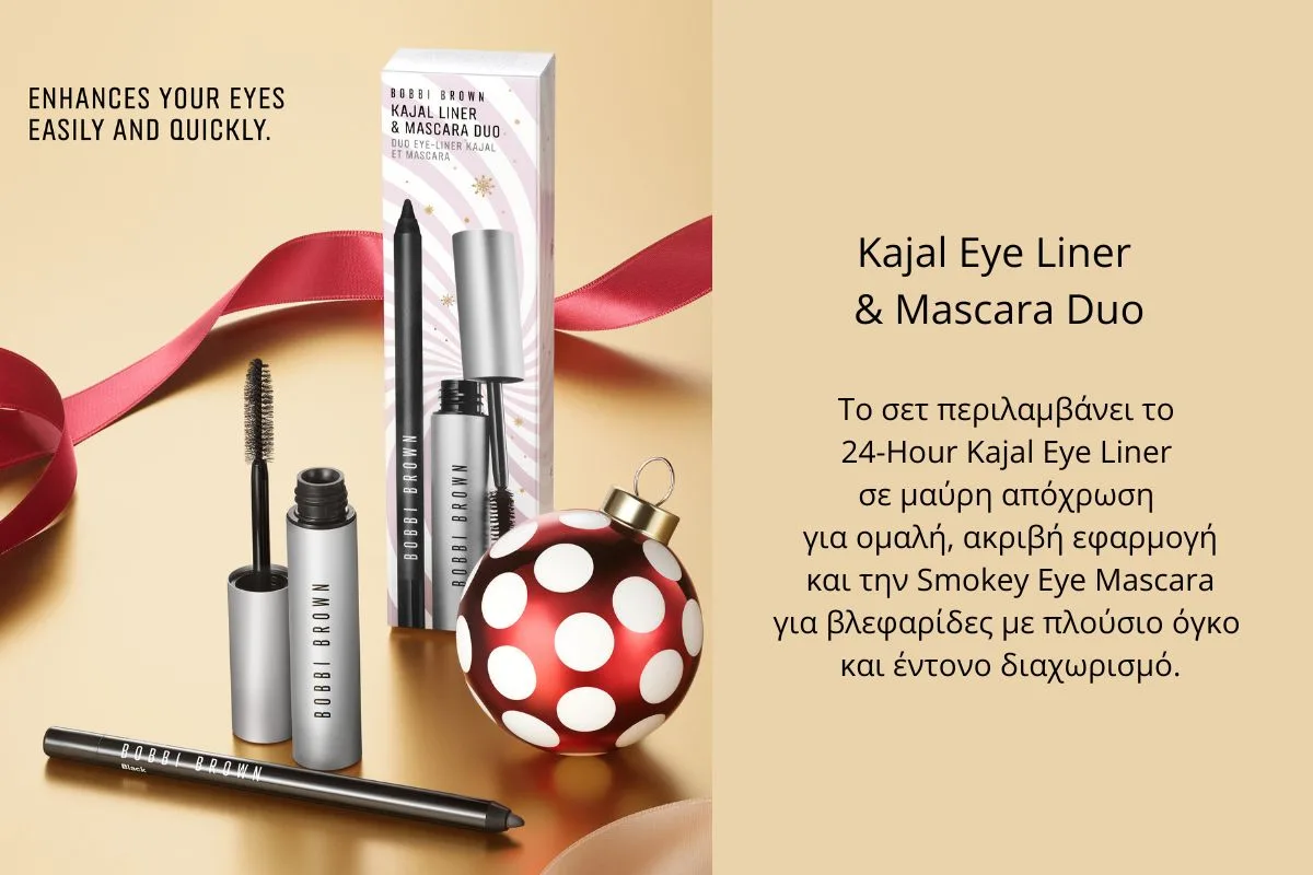 Ανακάλυψε το μυστικό για ένα effortless, έντονα τονισμένο βλέμμα με αυτό το limited-edition σετ, της Bobbi Brown. Το σετ περιλαμβάνει το 24-Hour Kajal Eye Liner σε μαύρη απόχρωση για ομαλή, ακριβή εφαρμογή και την Smokey Eye Mascara για βλεφαρίδες με πλούσιο όγκο και έντονο διαχωρισμό.