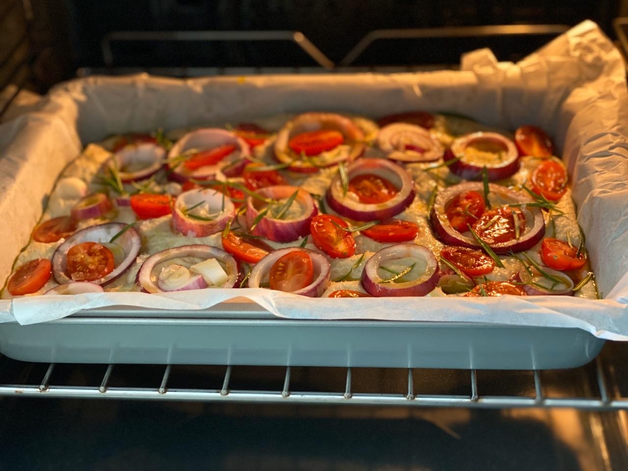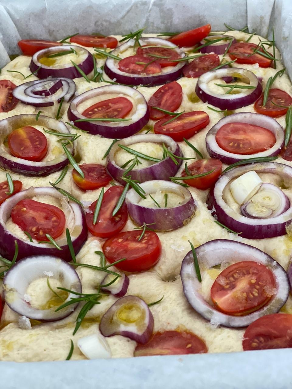 Focaccia construction video for those who are just starting!! My go to recipe by @breadtopia & @breadwriter . If you don’t have sourdough then head to breadtopia.com and they have the below in the yeast version too! Here is the recipe: ➢ 380g bread flour ➢ 95g any whole wheat flour ➢ 345g water ( I used about 400g today) ➢ 100g starter though the recipe calls for 143g sourdough starter but that’s all I had (a lazy starter works too!) ➢ 15g honey ➢ 13g olive oil ➢ 10g salt ⏩Mix all ingredients in the bowl of a stand mixer for 2m at low speed and 8m at medium speed.⏩Transfer mixture in an oiled bowl and bench rest for 1 hr and then do 4 s&f every 30 min – make sure you oil your hands before doing them as this is a very wet/sticky/almost runny dough.⏩ I covered the bowl and put it in the fridge (I admit I forgot it there for 2 days) took it and let it rest for 30’.⏩Put parchment paper to carefully line a baking pan (13x9x2 inc) (sides too). Oil with about 2 tbsp of olive oil (sides too again).⏩Cover the pan with 2 clean plastic grocery bags & use binder clips to keep the bags from touching and sticking to the dough: Melissa’s words of wisdom which made my life easier!!⏩ let it sit on the bench for 2 hours or so before baking. Bubbly dough.⏩Drizzle (plenty) of olive oil on the top of the dough and do the five finger rhythm dimple! 🎼⏩Add anything you like on top (for me here it was red onions, oregano & rosemary – you can add cherry tomatoes, olives, peppers or anything really) and sprinkle with sea salt (coarse ).⏩Bake in preheated oven at 220 for 15 min, rotate pan and bake another 10-15. Cover with foil if it gets too brown while baking. . #focaccia #sourdoughfocaccia #f52grams #sourdough #homemade #homebaking #masamadre #foodnetwork #sourdoughbaking #breadtalk #bakefromscratch #breadjourney #lievitomadre #focacciabread #freshherbs #oliveoil #stayhomeandbake #onions #homebakedbread #wildyeast #breadlover #cyprusfood #recipes #breadporn #sourdoughbread