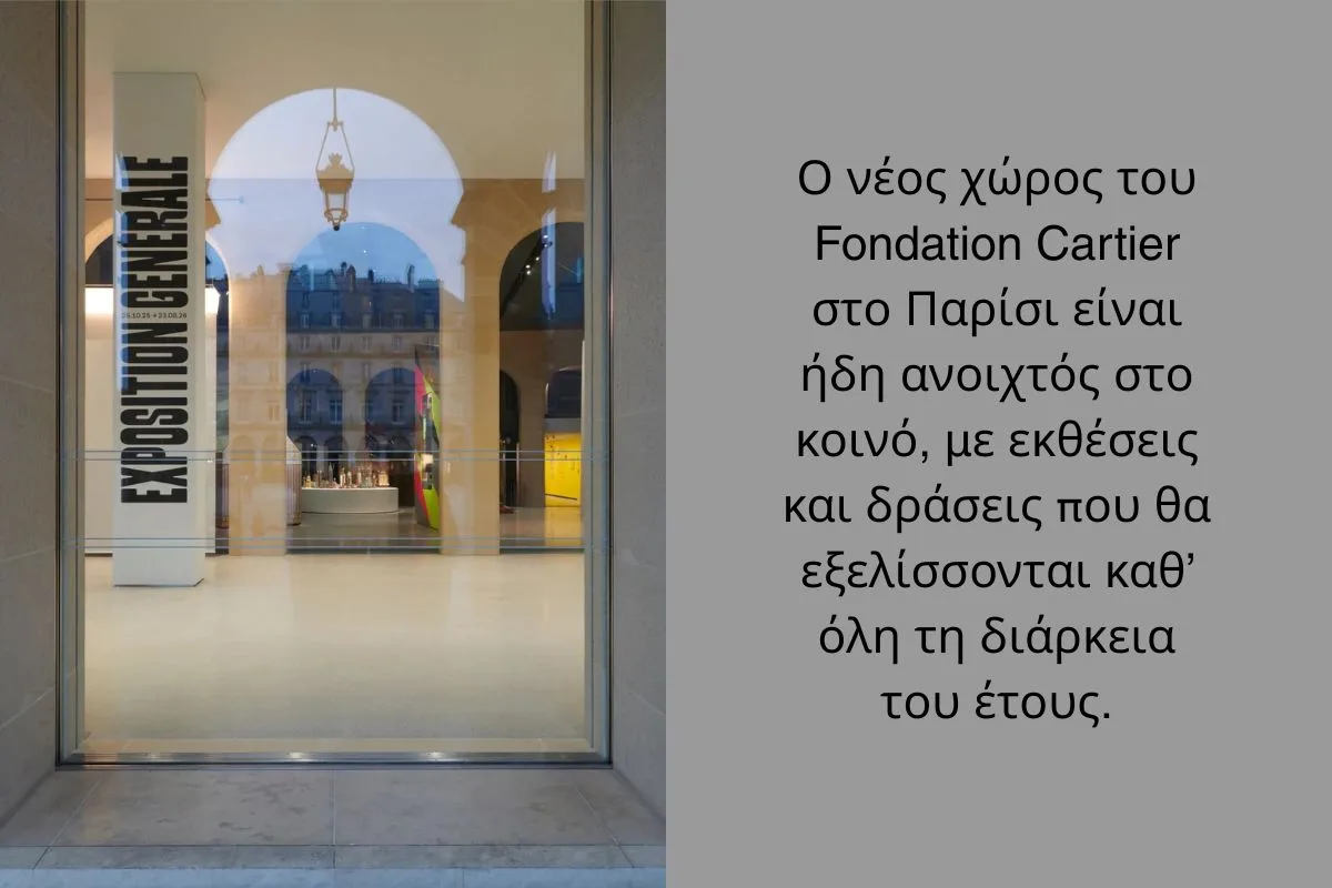 Ο νέος χώρος του Fondation Cartier είναι πιο μεγάλος και ευέλικτος, και σχεδιάστηκε για να φιλοξενεί έργα από διαφορετικά καλλιτεχνικά πεδία: Από τις εικαστικές τέχνες και το design μέχρι την performance και τον κινηματογράφο. Οι ευρύχωρες αίθουσες, τα υψηλά ταβάνια και τα μεγάλα παράθυρα δημιουργούν έναν ζωντανό διάλογο ανάμεσα στην πόλη και τις εκθέσεις, δίνοντας στον επισκέπτη την αίσθηση ότι η τέχνη «αναπνέει» μαζί με το Παρίσι.Η εναρκτήρια έκθεση, βασισμένη στη μόνιμη συλλογή του ιδρύματος, παρουσιάζει μια πλούσια αναδρομή στη σύγχρονη δημιουργία των τελευταίων δεκαετιών. Η σκηνοθεσία της αξιοποιεί τη νέα, αρθρωτή αρχιτεκτονική του χώρου, επιτρέποντας στα έργα να συνδιαλέγονται μεταξύ τους, πέρα από τα όρια είδους ή τεχνικής.Με αυτή τη μετεγκατάσταση, το Fondation Cartier επιβεβαιώνει τη διαρκή του δέσμευση στον πειραματισμό και τη διεπιστημονική έκφραση. Στόχος του παραμένει να προσφέρει μια πλατφόρμα τόσο σε καταξιωμένους όσο και σε νέους καλλιτέχνες, προσκαλώντας το κοινό σε μια αυθεντική, βιωματική εμπειρία της σύγχρονης κουλτούρας.Ο νέος χώρος του Παρισιού είναι ήδη ανοιχτός στο κοινό, με εκθέσεις και δράσεις που θα εξελίσσονται καθ’ όλη τη διάρκεια του έτους. Επομένως, εάν βρεθείς στην πόλη του Φωτός, στο Παρίσι, μην χάσεις την ευκαιρία να επισκεφθείς το Fondation Cartier στην Place du Palais-Royal.