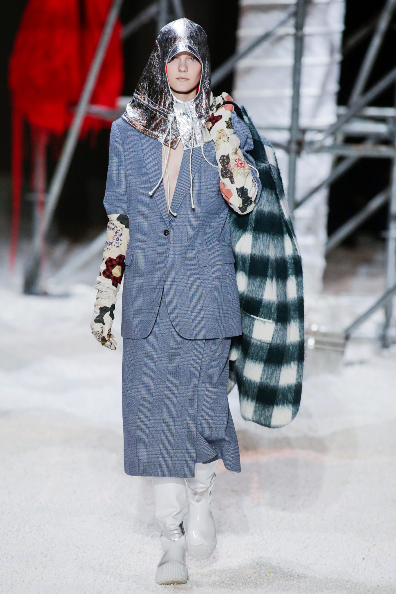 Ακολούθησαν διάφορα look με καρό και ριγέ σύνολα, patchworks, denim, διαφάνειες και 3D φλοράλ στοιχεία. Επίσης, εκτός από τις Dior’s iconic Lady bags, είδαμε τσάντες σε στυλ ταχυδρόμου και πολλά backpacks. Τέλος, σημειώστε ότι καπέλα ήταν ανάμεσα στους πρωταγωνιστές της συλλογής (μπερέδες, καπέλα στυλ Μπολσεβίκου κ.α.), που συνδυάστηκαν με μαύρες αρβύλες και τσόκαρα.