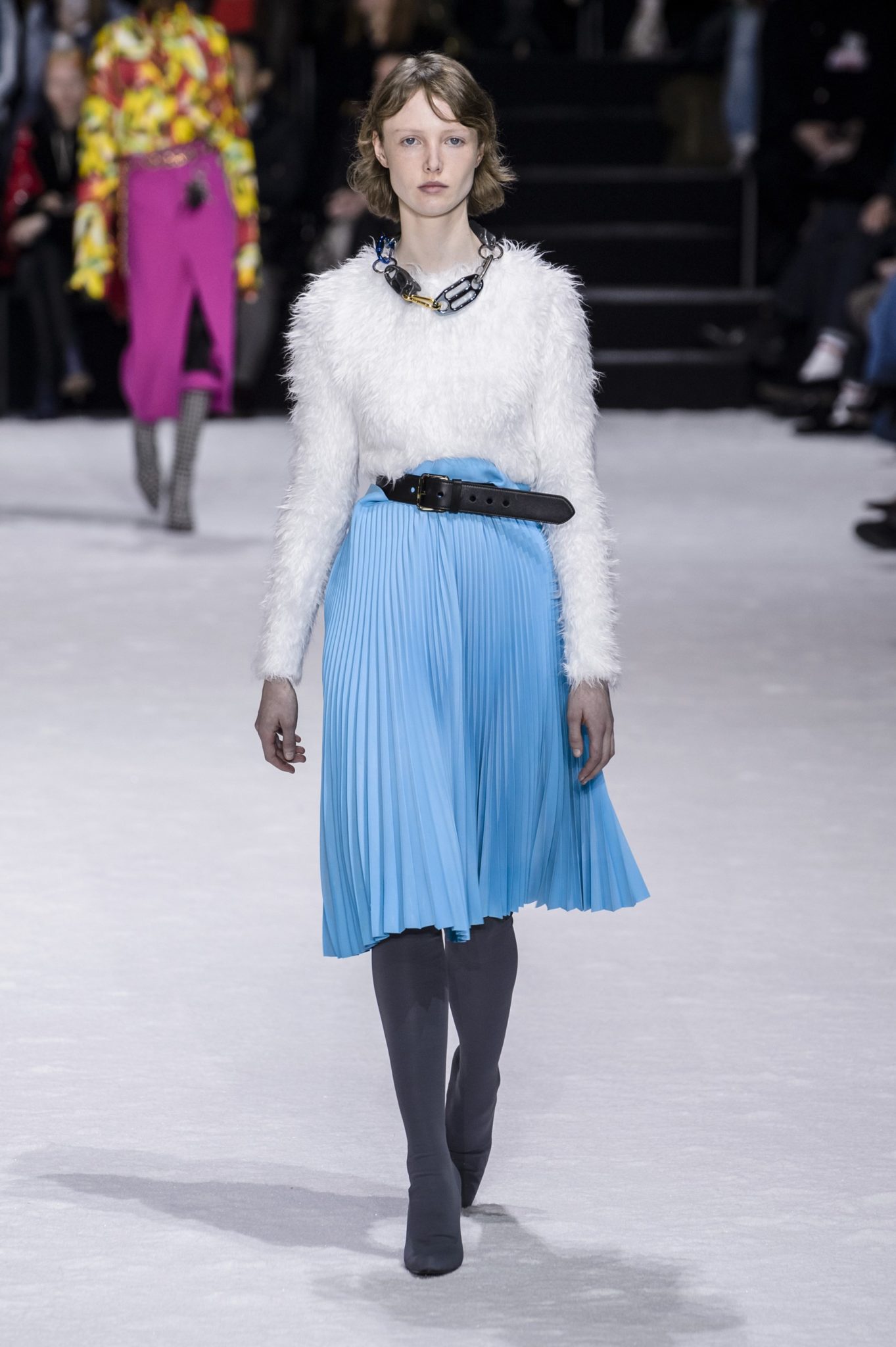Φυσικά, εκτός από τα μίντι outfits του, ο Balenciaga πρότεινε και μίνι φορέματα από βελούδο, φλοράλ ή μεταλλικά υφάσματα. Για τα κλασικά office σύνολα, προτείνει ιδιαίτερα σακάκια, πάνω από κλασικά παντελόνια και βελούδινα tops.