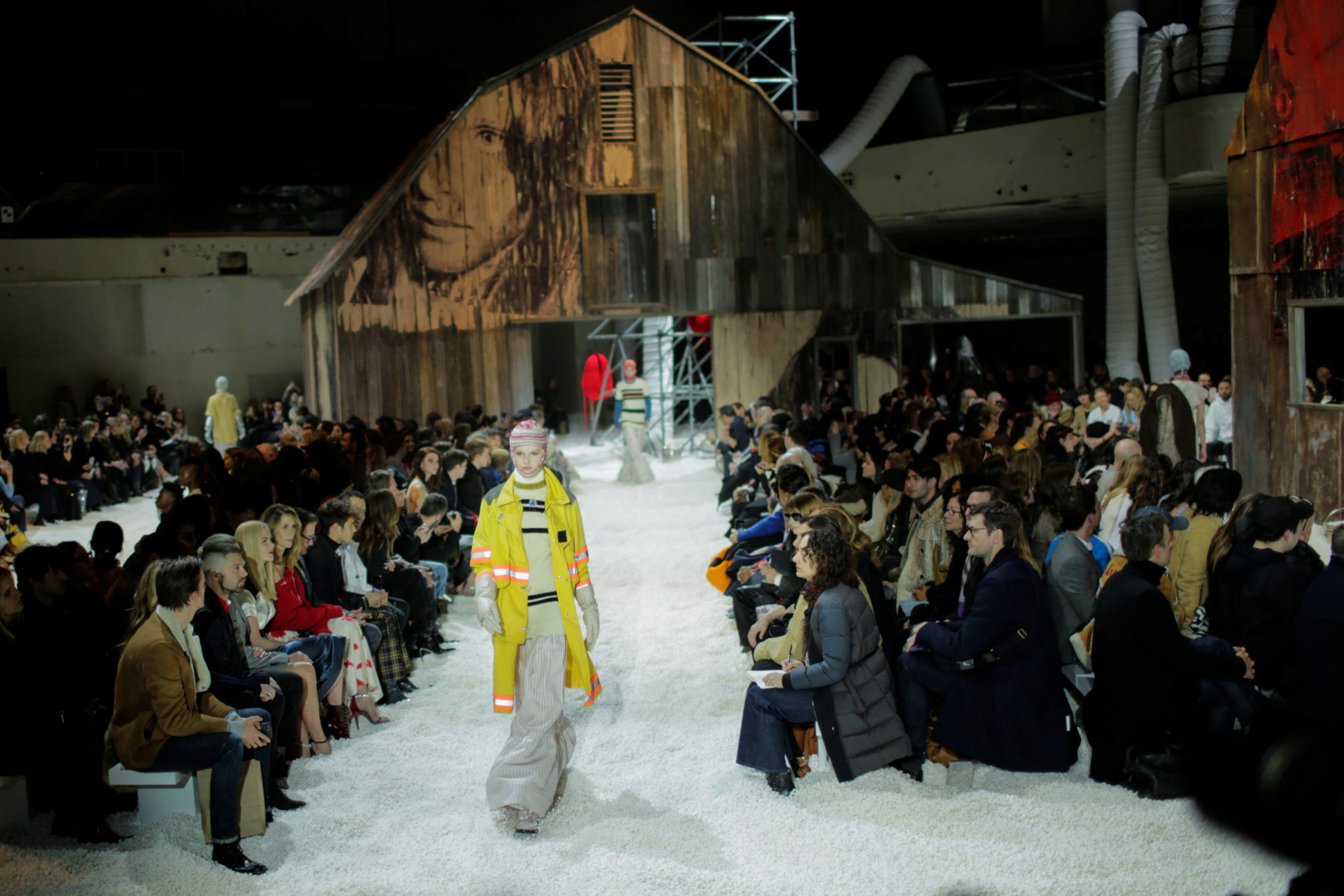 Ο Raf Simons στο τιμόνι του Calvin Klein παρουσίασε πανωφόρια και ογκώδη παντελόνια που έμοιαζαν με στολές πυροσβεστών, προστατευτικά γάντια και λαστιχένιες μπότες πάνω από το γόνατο.