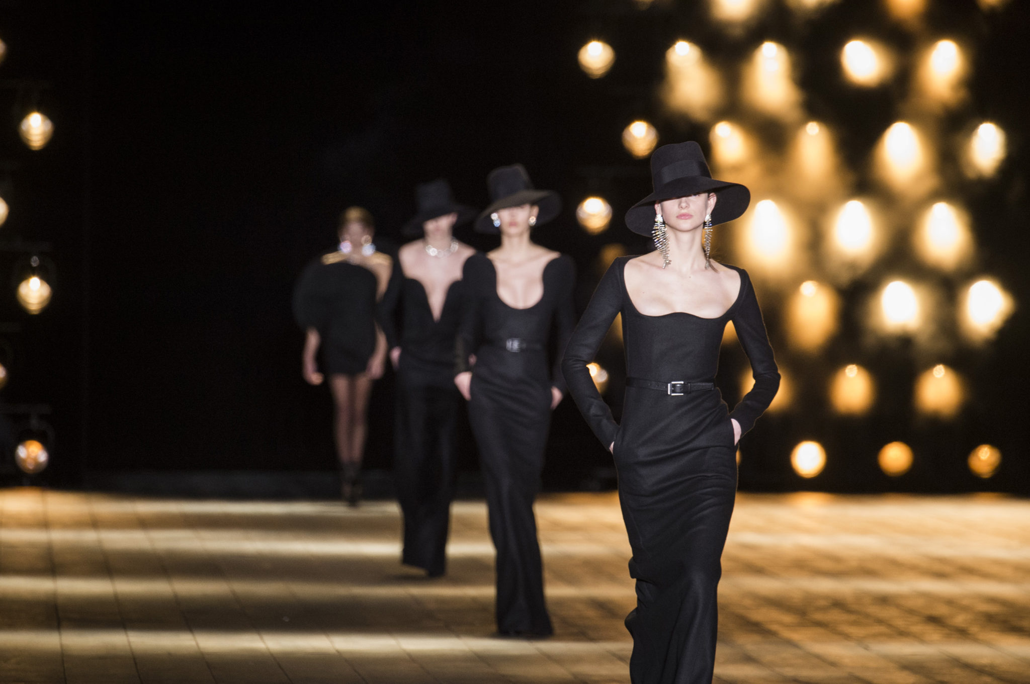 Το total black ήταν ο πρωταγωνιστής της συλλογής του οίκου Saint Laurent, αφού τα περισσότερα από τα σύνολα που παρουσιάστηκαν ήταν μαύρα. Κομμάτια όμως, που αναδεικνύουν την θηλυκότητα και το στιλ της σύγχρονης γυναίκας.