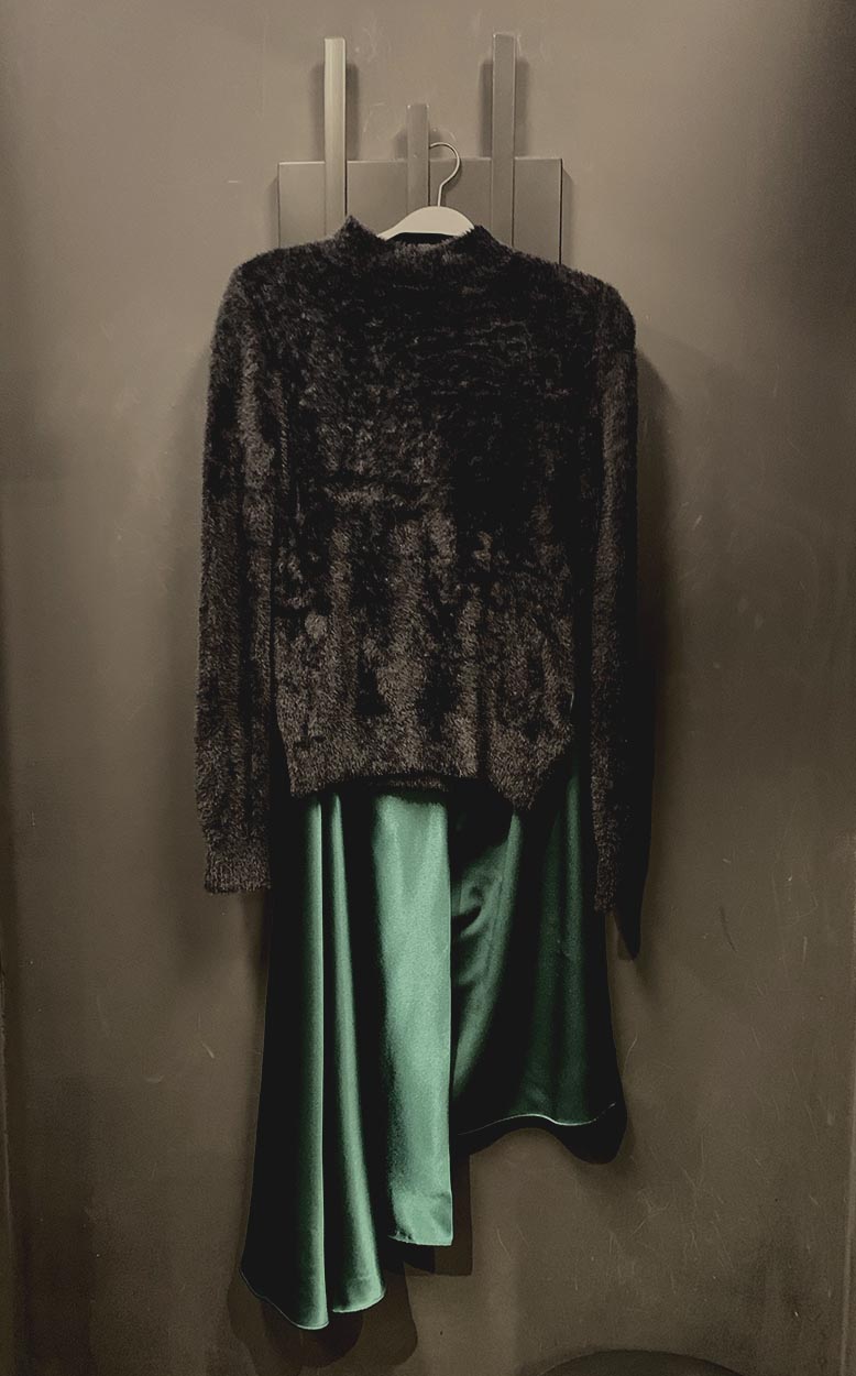 Πρώτη και καλύτερη επιλογή μας; Εδώ μας εντυπωσίασε το printed, ματ σατέν παντελόνι (€ 115), με την φευγαλέα γυαλάδα, που το κάνει ιδανικό για εμφανίσεις όλη την ημέρα. Γι’ αυτό μάλιστα, επιλέξαμε να το συνδυάσουμε μ’ ένα ολόμαλλο πουλόβερ (€ 149), από wool και alpaca, που επίσης είχε τη δική του τσαχπινιά. Ένας κόμπος στο κέντρο της μπροστινής πλευράς, και κοντά στη μέση, αφήνει να διακρίνεται ελάχιστα το δέρμα του σώματος.