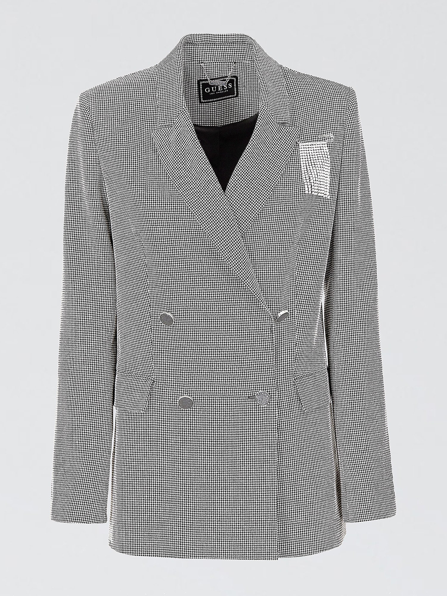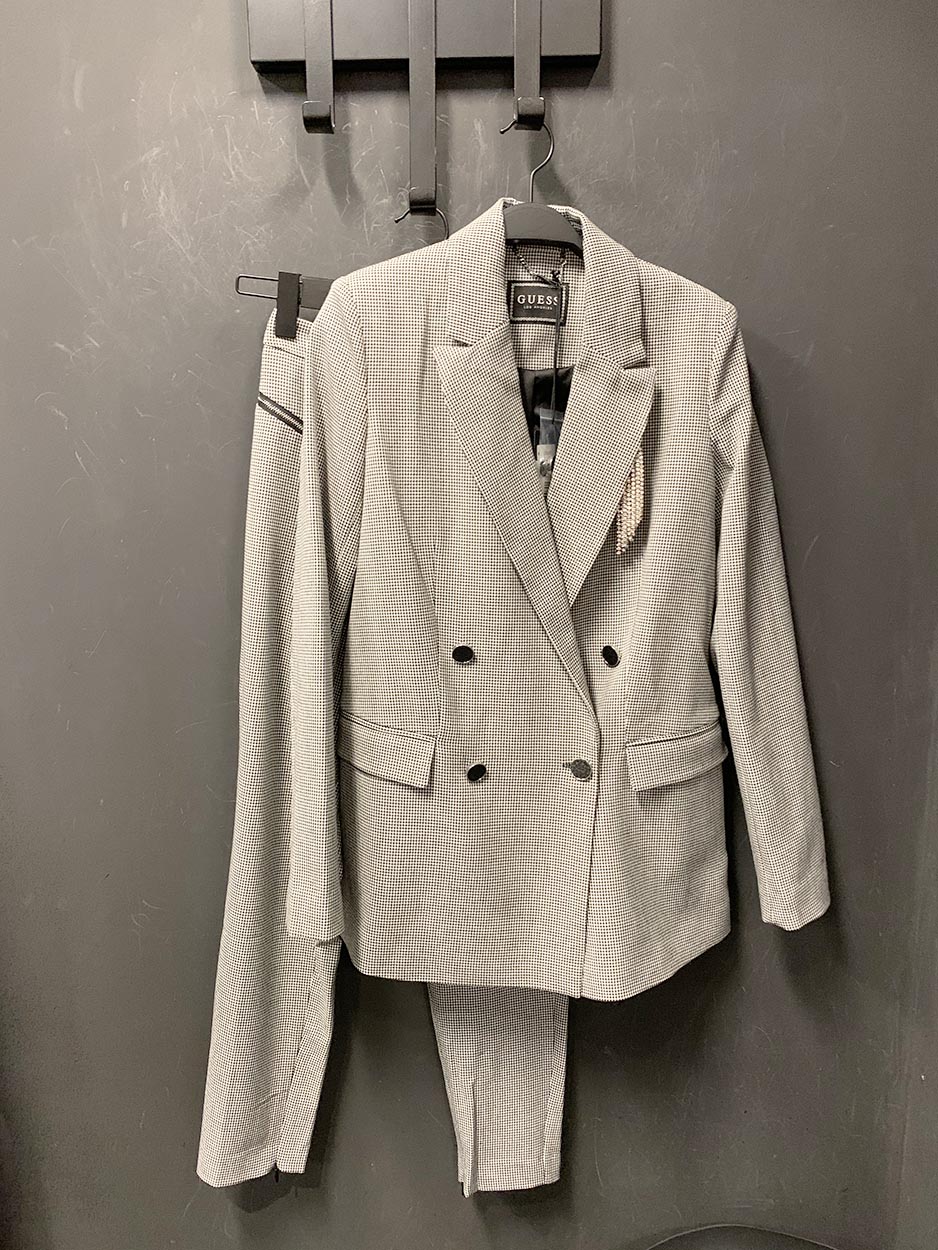 Δεύτερη επιλογή μας; Το κλασικό ασπρόμαυρο καρό κοστούμι, επίσης της Guess, με το μικροσκοπικό πιε ντε πουλ. Όμως αυτό δεν ήταν ένα απλό αντρικό κοστούμι…Όπως θα δεις στη λεπτομέρεια της φωτογραφίας, έχει τα δικά του κομψά στοιχεία,που τονίζουν τη θηλυκότητα…Αυτό το κομψό, σταυρωτό blazer (159,90€) λοιπόν, έχει τη δική του ιδιαιτερότητα. Η καρφίτσα από μικροσκοπικά, διάφανα κρυσταλλάκια στην αριστερή πλευρά του, το κάνει να ξεχωρίζει από ένα απλό, αντρικό σακάκι. Αλλά και το παντελόνι του (79,90€), αν και σε κλασική ίσια γραμμή, έχει κάτι διαφορετικό: Τα μπατζάκια του έχουν σχίσιμο στην εσωτερική πλευρά τους, που το κάνουν ακόμη πιο άνετο και stylish. Άλλωστε, όπως είδες, στη φωτογραφία πιο πάνω, η Μαρία έδειχνε ενθουσιασμένη μέσα σ’ αυτό το κοστούμι. Εναλλακτικά, εσύ μπορείς να το συνδυάσεις μ’ ένα λεπτό πουλοβεράκι, για ένα τέλειο office look.
