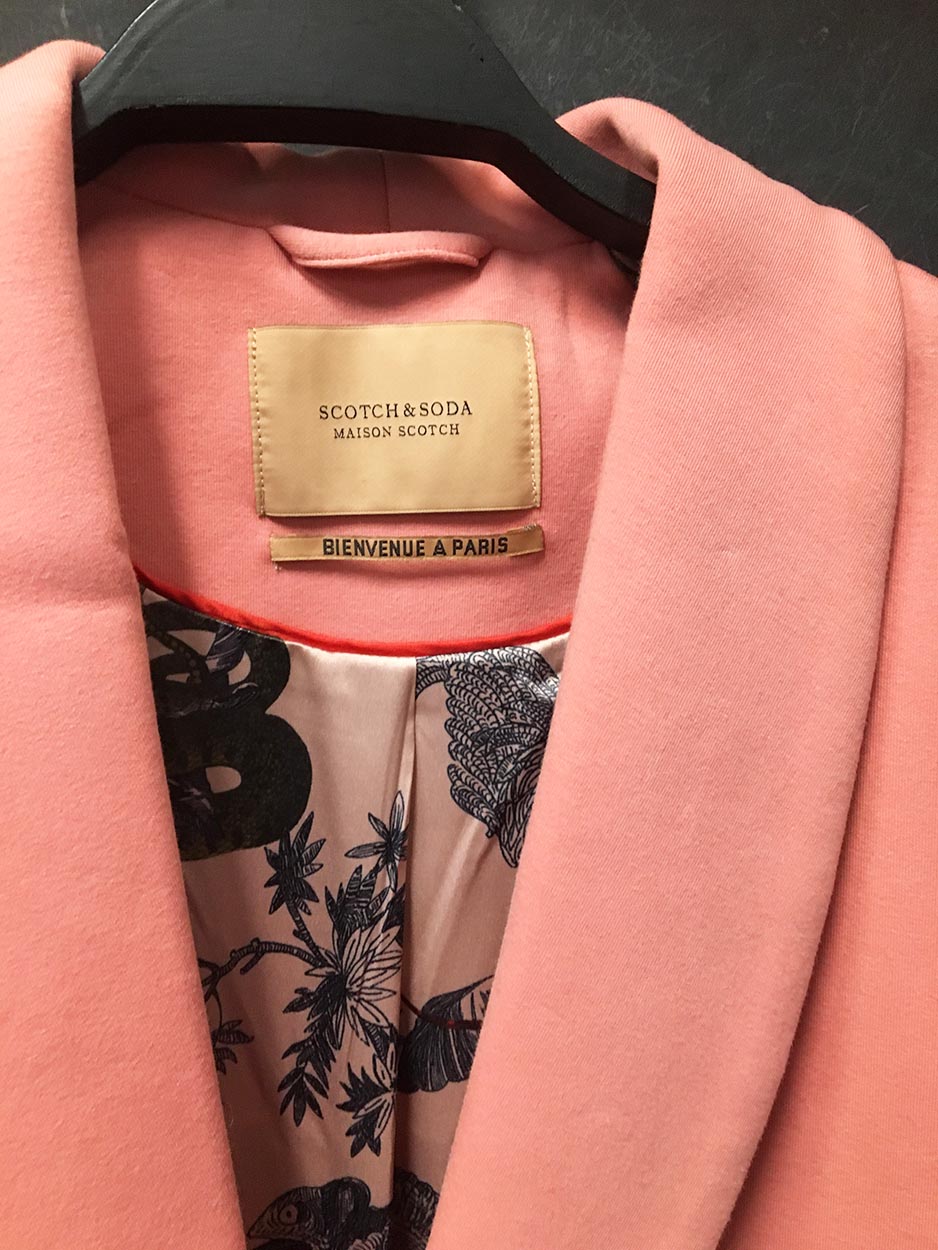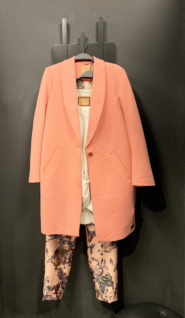 Για να δώσουμε στο σύνολο ακόμη πιο ζεστή χροιά, το συνδυάσαμε με ένα υπέροχο κλασικό, μακρύ σακάκι/παλτό (€ 209), επίσης, από τη συλλογή της Scotch & Soda. Μιλάμε για ένα σακάκι μέχρι το γόνατο, με στρογγυλό πέτο, επενδυμένο με φόδρα που έχει το ίδιο print με το παντελόνι. Η blushed pink (ροδακινί) απόχρωσή του, μια απόχρωση γεμάτη φρεσκάδα, το κάνει τόσο ιδιαίτερο, και σίγουρα είναι ο καλύτερος τρόπος για να ανανεώσεις το στυλ σου μεσ’ το μουντό τοπίο του χειμώνα που έρχεται…