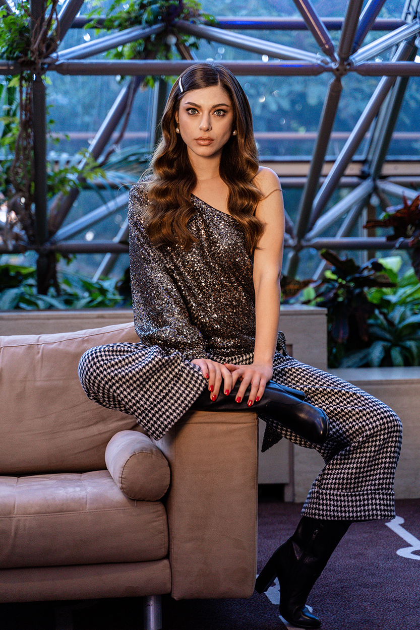 Εδώ η Έλενα φορά κοστούμι με blazer και σορτ, από βελούδο με ασημένια πουά, της Lili Sidonio για τη συλλογή τουMolly Bracken, από το Collective.