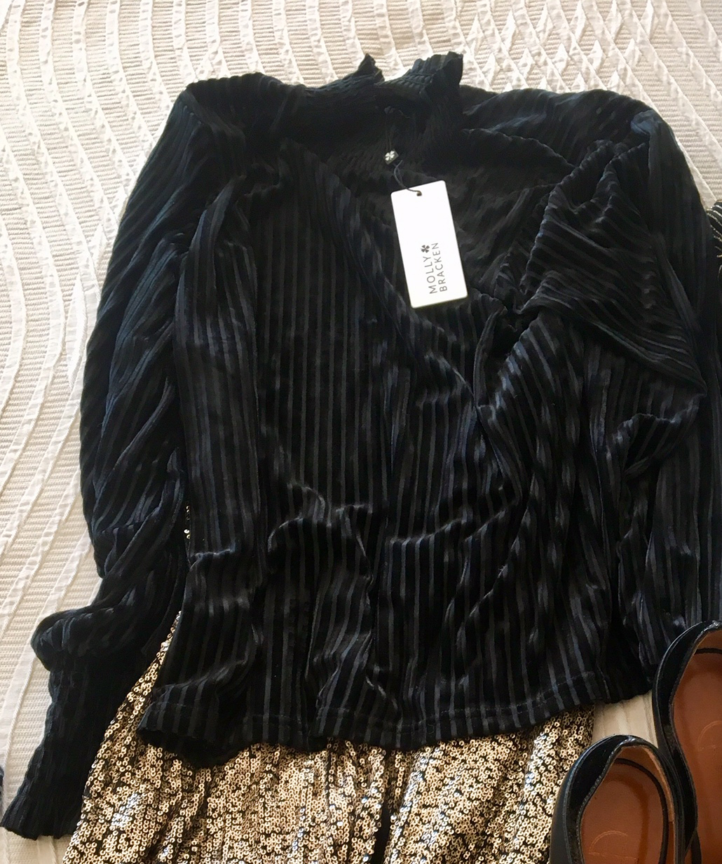 Και το συνδύασε με ένα κομψό βελούδινο, πλισέ μπλουζάκι του Molly Bracken.