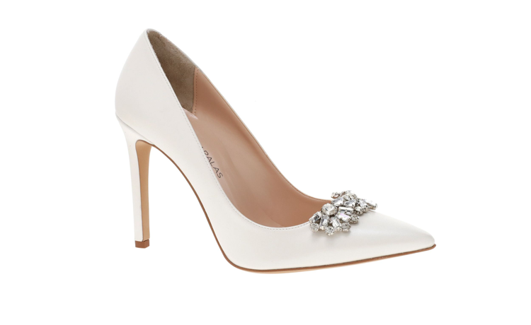 Οι λευκές δερμάτινες γόβες της, με τις διακοσμητικά κρύσταλλα, είναι από τη νέα συλλογή της Haralas.