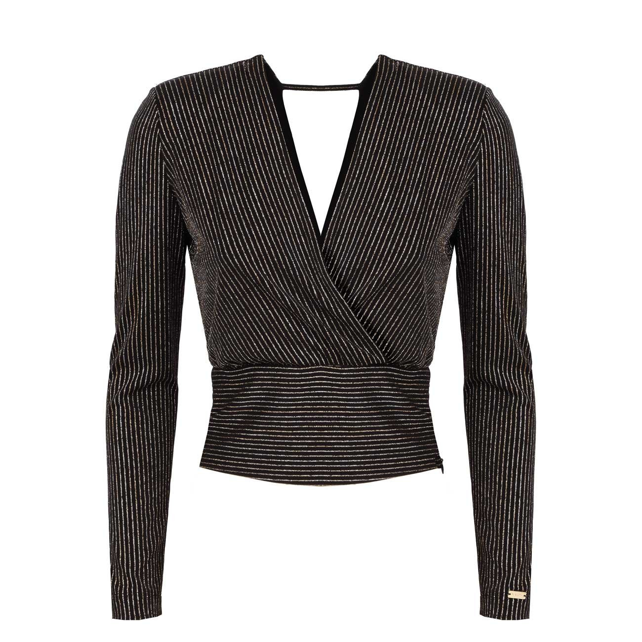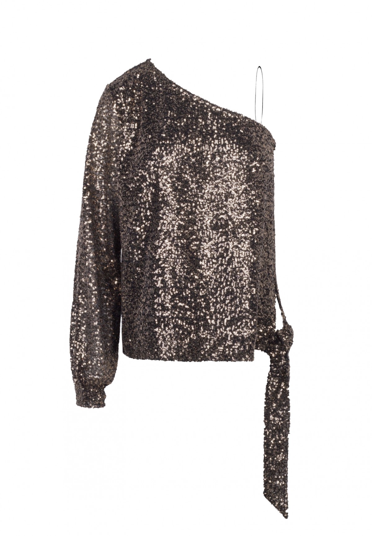 Και της τη συνδυάσαμε με χρυσή μπλούζα RELIGION PHOENIX TOP με κεντημένες χρυσές παγιέτες σε όλη την επιφάνειά της.