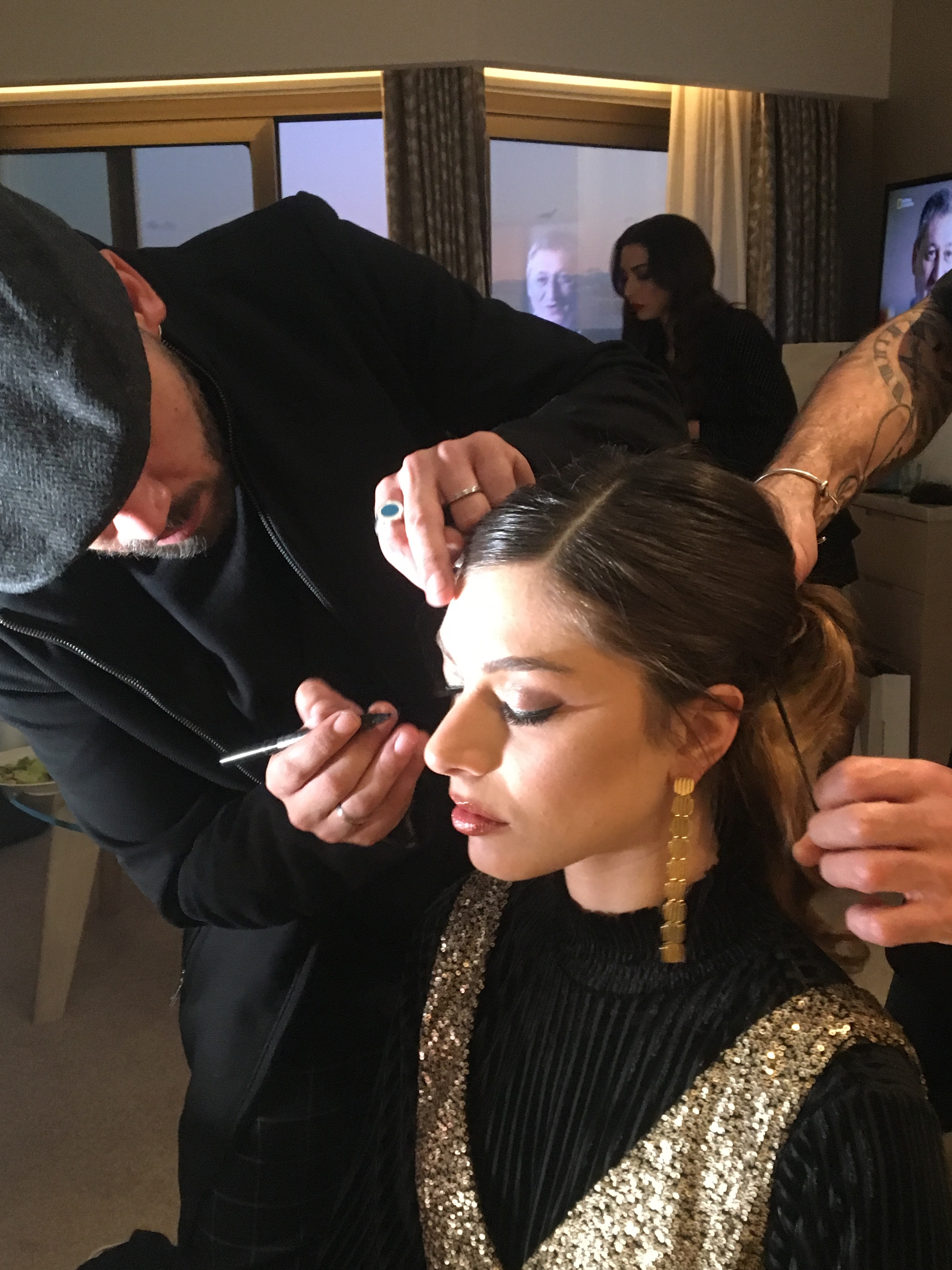 Mε την ίδια τεχνική ο Βαλεντίνο έκανε και το μακιγιάζ των ματιών της Έλενας. Με τη διαφορά ότι χρησιμοποίησε την 4-Colour Eye Palette Νο 05 Smoky, σε γκρίζες ασημί αποχρώσεις.