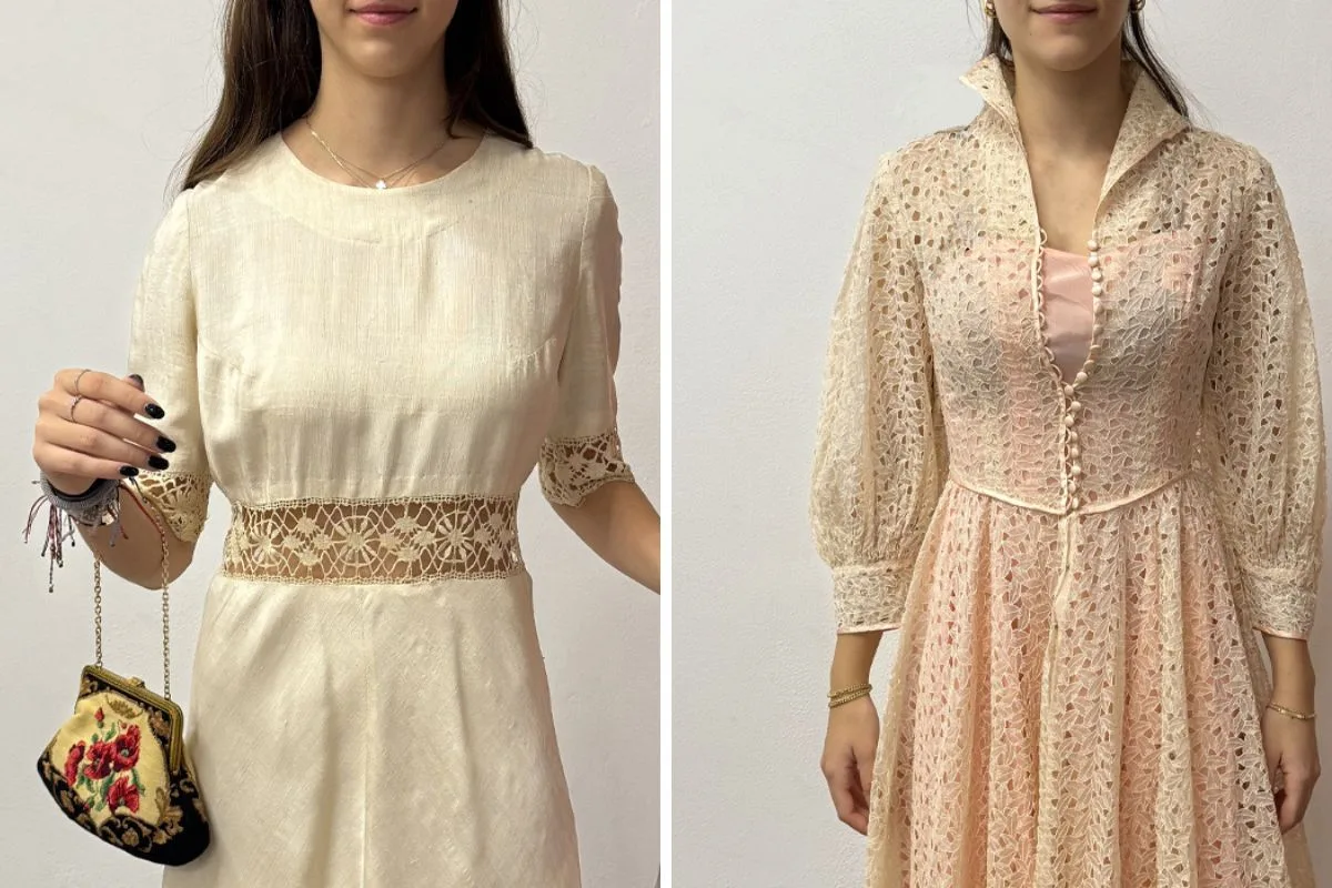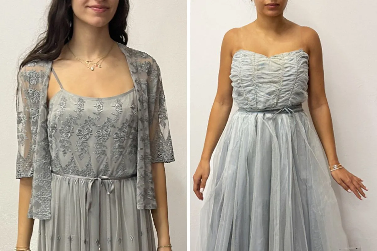 Αριστερά, φόρεμα cocktail, 1940. Δεξιά, μίντι στράπλες βραδινό φόρεμα, 1990.