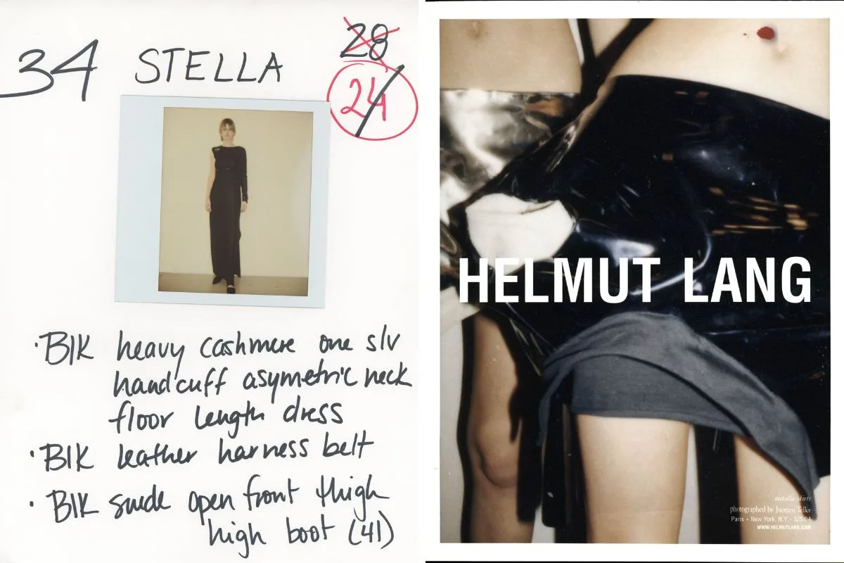 Αριστερά, Helmut Lang, Show Fitting Polaroid on paper with handwritten look descriptions, Helmut Lang Collection Hommes Femmes Séance de Travail Défilé # Hiver 01/02 (2001). Depicted person: Stella Tennant. MAK Helmut Lang Archive. Courtesy of hl-art. Δεξιά, Helmut Lang, test print of an advertisement featuring “metallic skirts,” Helmut Lang Collection Hommes Femmes Séance de Travail Défilé # Été 04, backstage photograph by Juergen Teller MAK Helmut Lang Archive, LNI 1778-4-57. Courtesy of hl-art