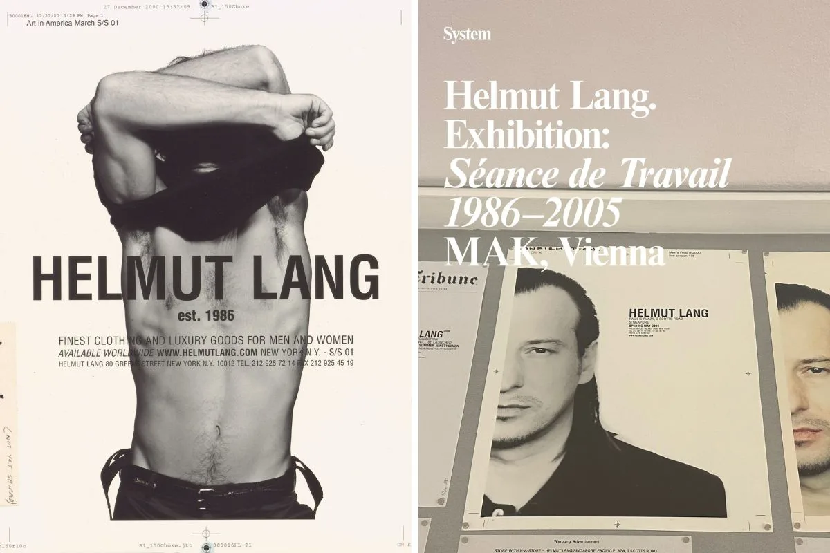 Αριστερά, Helmut Lang, test print of an advertisement for Art in America magazine, Helmut Lang Collection Hommes Femmes Séance de Travail # Été 01, photography by Inez van Lamsweerde and Vinoodh Matadin (2000). Depicted person: Andoni Anastasse. MAK Helmut Lang Archive, LNI 566-9-5-1. Courtesy of hl-art. Δεξιά, ένα black-and-white αντίγραφο διαφήμισης που ανακοίνωνε τα πρώτα jeans του Helmut Lang – τον Ιούλιο του 1996. Photography by Elfie Semotan. MAK Helmut Lang Archive, LNI 536-170. Courtesy of hl-art.