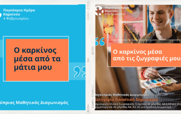 Ο 3ος Παγκύπριος μαθητικός διαγωνισμός για την Παγκόσμια Ημέρα Καρκίνου έχει θέμα: «Ο καρκίνος μέσα από τα μάτια μου!» και αναμένεται να στεφθεί και φέτος με ιδιαίτερη επιτυχία. Με τραγούδι, εικαστική δημιουργία και έκθεση ιδεών, οι νέοι καλούνται να συμμετάσχουν στον 3ο Παγκύπριο Διαγωνισμό για την Παγκόσμια Ημέρα Καρκίνου.
