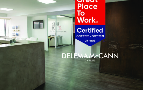 H DELEMA McCANN κέρδισε την πιστοποίηση Great Place to Work® Τί σημαίνει αυτό; Απλά, στην αξιολόγηση του εργασιακού περιβάλλοντος εταιρειών από το Great Place to Work®, η DELEMA McCANN είναι η πρώτη εταιρεία του κλάδου διαφήμισης/επικοινωνίας στην Κύπρο, που έχει πετύχει αυτή την πολύ σημαντική αναγνώριση. Η Διευθύνουσα Σύμβουλος