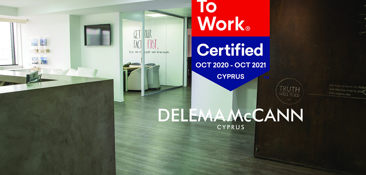 H DELEMA McCANN κέρδισε την πιστοποίηση Great Place to Work® Τί σημαίνει αυτό; Απλά, στην αξιολόγηση του εργασιακού περιβάλλοντος εταιρειών από το Great Place to Work®, η DELEMA McCANN είναι η πρώτη εταιρεία του κλάδου διαφήμισης/επικοινωνίας στην Κύπρο, που έχει πετύχει αυτή την πολύ σημαντική αναγνώριση. Η Διευθύνουσα Σύμβουλος
