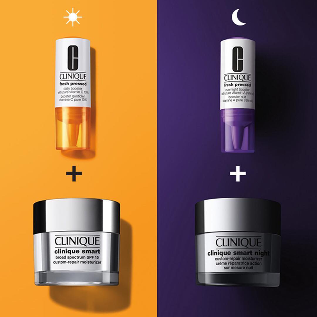 Τι εννοούμε; Οι κλινικές μελέτες της Clinique μιλούν: Απέδειξαν ότι η χρήση του Fresh Pressed Vitamin C την ημέρα και Vitamin A την νύχτα για 12 εβδομάδες χαρίζει αποτελέσματα ισοδύναμα με αυτά των κορυφαίων δερματολογικών αγωγών για τη μείωση της όψης των γραμμών και των ρυτίδων.