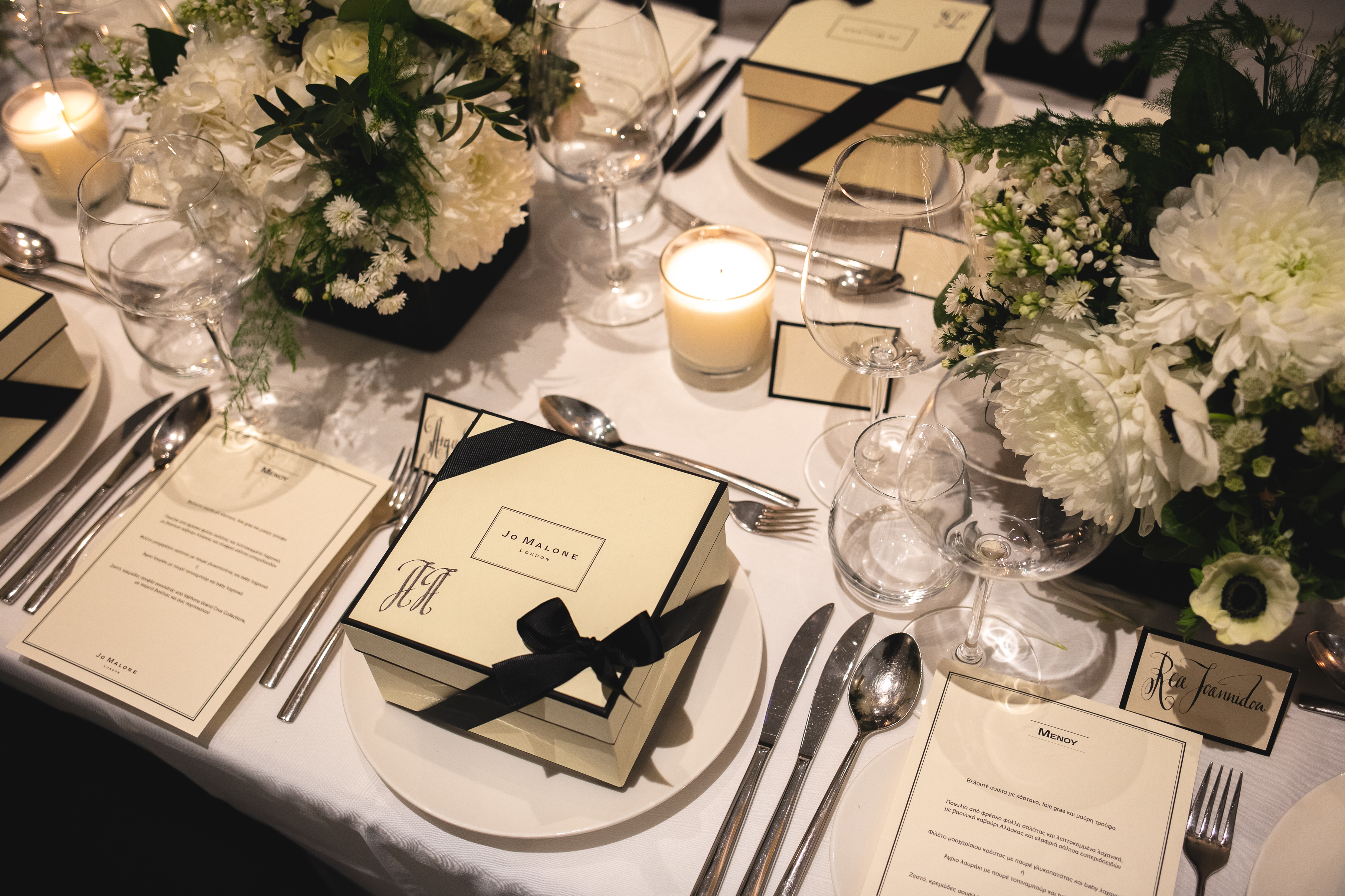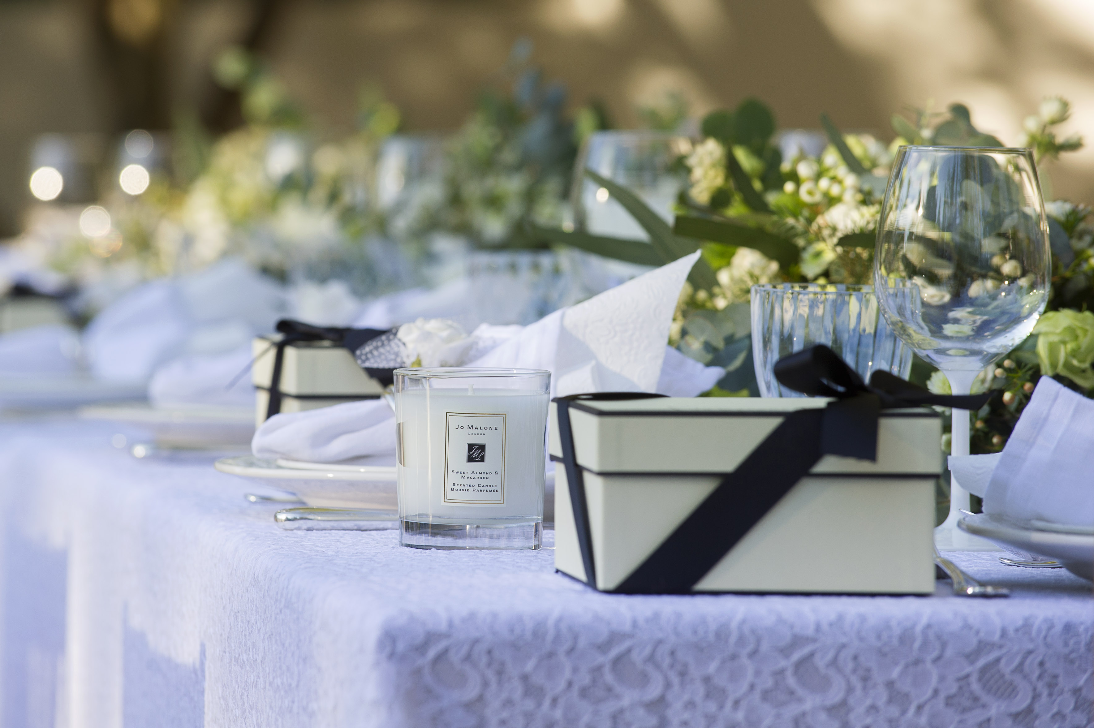 Ναι, υπάρχει και μια άλλη, ακόμη πιο πρωτότυπη ιδέα… Εκτός από τη διακόσμηση των τραπεζιών σας μπορείτε κάλλιστα να προσφέρετε τα κεριά, τα αρώματα, ή και τα body lotions της Jo Malone London ως δώρο στους καλεσμένους σας. Κλεισμένα στο εικονικό κουτί Jo Malone London, που μπορεί να έχει χαραγμένο ακόμα και το μονόγραμμα του κάθε καλεσμένου, βρίσκουν τη θέση τους πλάι στο πιάτο του καθενός! Και σίγουρα θα είναι το μεγαλύτερο surprise! Εννοείται θα είναι το πιο ευπρόσδεκτο αναμνηστικό του γάμου σας σε όλους όσοι θα σας ακολουθήσουν σ’ αυτό το νέο μονοπάτι της ζωής σας.