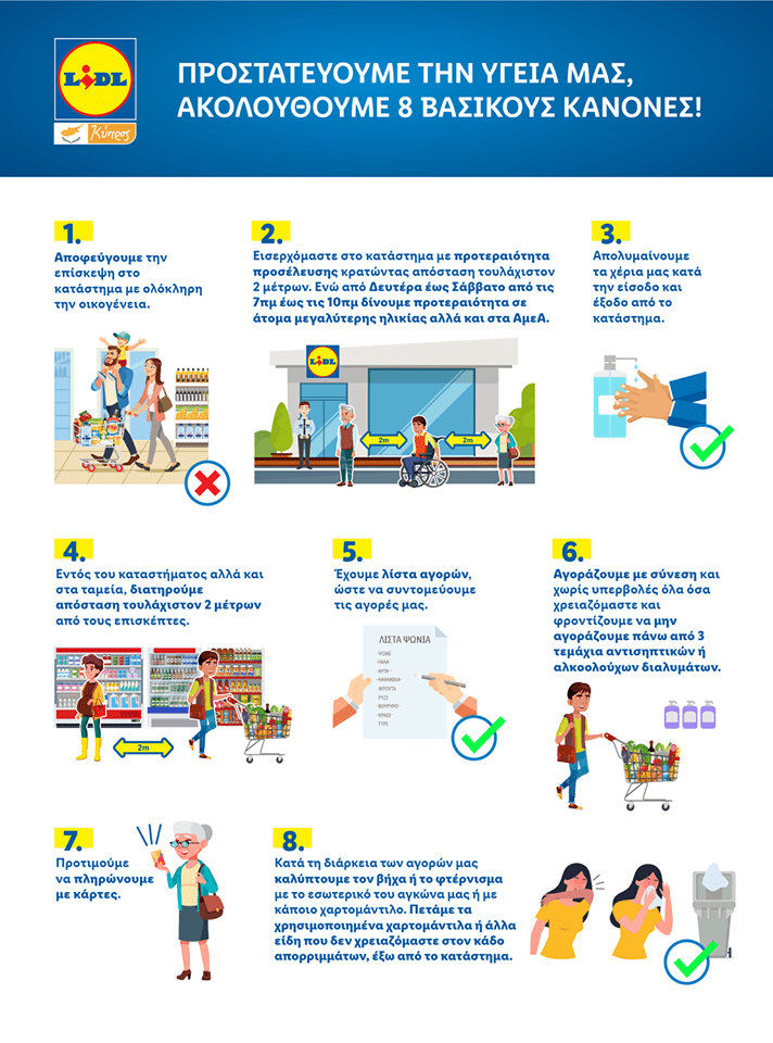 Η Lidl Κύπρου, δηλώνει παρούσα στη μάχη κατά της πανδημίας και δίπλα σε όλους τους ανθρώπους στην Κύπρο. Συμμορφώνεται απόλυτα και προάγει τακτικές για ασφαλή αγοραστική εμπειρία σε όλα τα καταστήματά της. Εφαρμόζει διαδικασίες ασφαλούς εργασίας του προσωπικού της και τους αμοίβει για την υπερπροσπάθειά τους. Παράλληλα, φροντίζει για την απρόσκοπτη προμήθεια προϊόντων και επιδιώκει να ανακουφίσει συμπολίτες μας με την προσφορά.