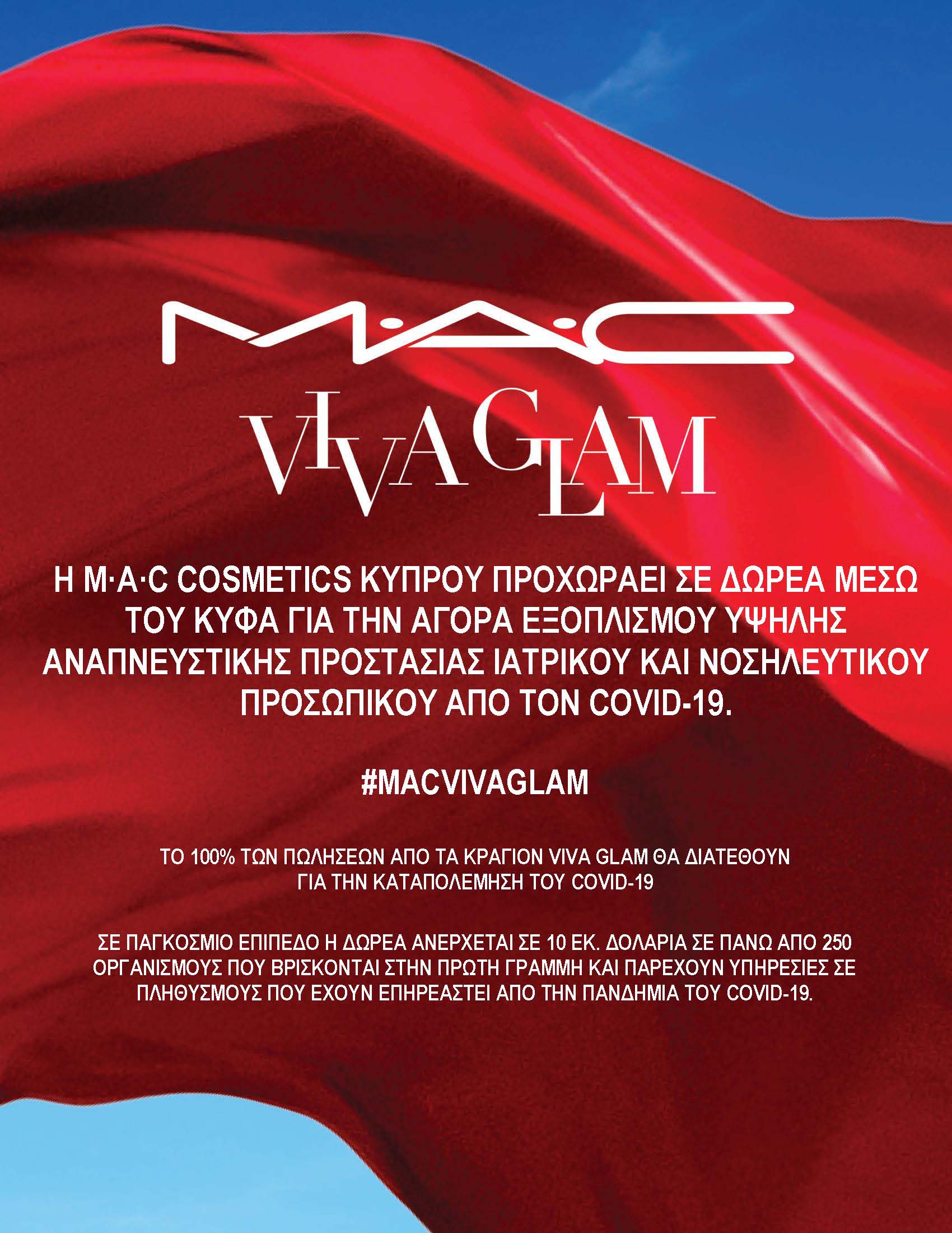 Στην Ελλάδα, η M·A·C COSMETICS Ελλάδος μέσω του M·A·C VIVA GLAM προχωράει σε δωρεά 100,000€ για την καταπολέμηση του COVID-19, στηρίζοντας το Εθνικό Σύστημα Υγείας.