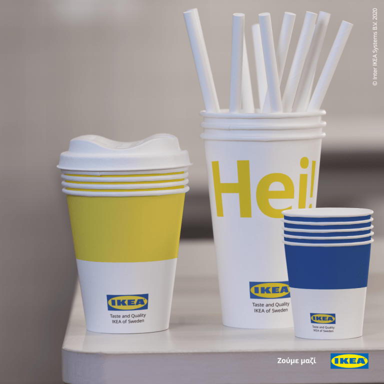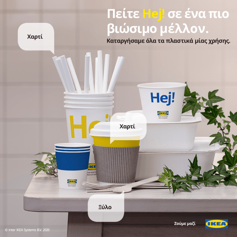 Η IKEA προχώρησε στην κατάργηση πλαστικών μιας χρήσης από τη συλλογή των προϊόντων της, από το IKEA Café, το IKEA Bistro και το εστιατόριο της IKEA και αντικατέστησε τα καλαμάκια, τα μαχαιροπίρουνα, τα ποτήρια και τα πιάτα με αναλώσιμα που τα υλικά τους προέρχονται από 100% βιώσιμες πηγές.