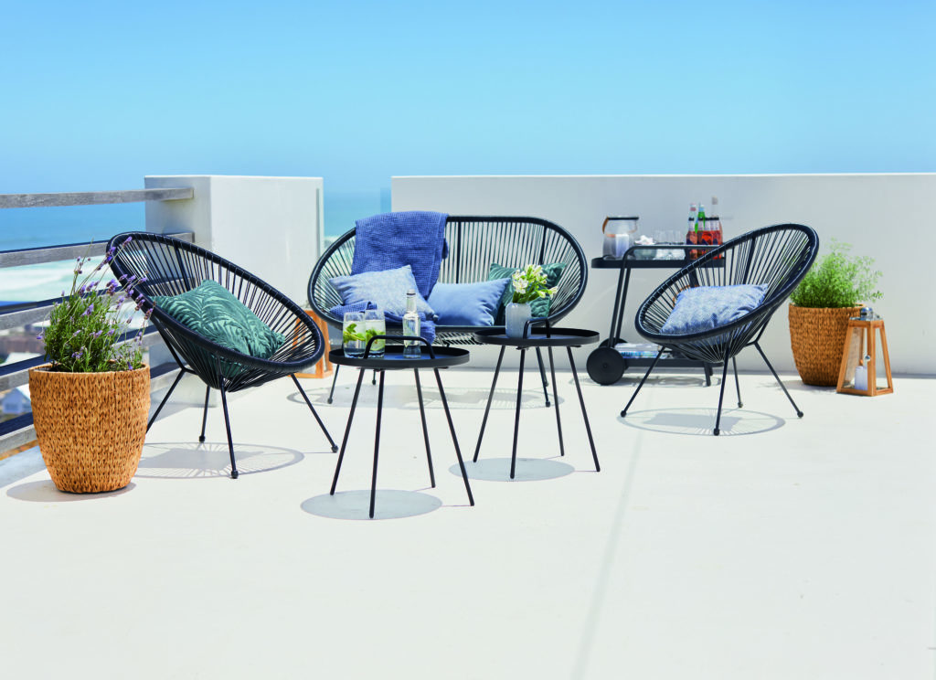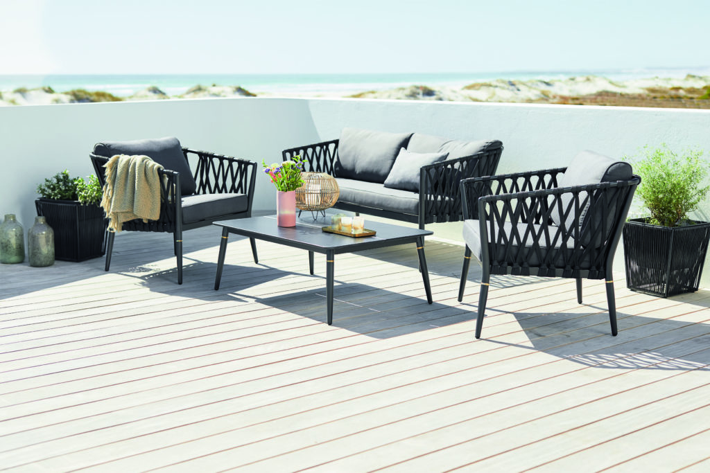 Αν θα είχα πιο μοντέρνο σπίτι στην εξοχή, θα επέλεγα το μαύρο σαλονάκι Lounge set HOLTE, που περιλαμβάνει διθέσιο καναπέ, δύο καρέκλες και τραπέζι από αλουμίνιο και durawood – ένα συνθετικό υλικό που αποτελείται από ίνες FSC σκληρού ξύλου και πλαστικό, που το κάνει super ανθεκτικό στις διακυμάνσεις της θερμοκρασίας.