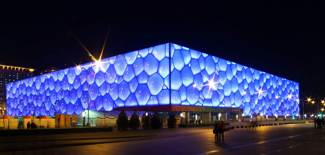 Εντυπωσιακός είναι και ο «υδάτινος κύβος», το Ολυμπιακό Κολυμβητήριο, το οποίο σχεδιάστηκε από την αρχιτεκτονική ομάδα των Αυστραλών PTW, το οποίο αντί για τοίχους, έχει επιφάνειες από διαφανές συνθετικό υλικό που σχηματίζουν κυψελωτά μοτίβα, σαν να βλέπεις τη μοριακή δομή του νερού σε μικροσκόπιο.