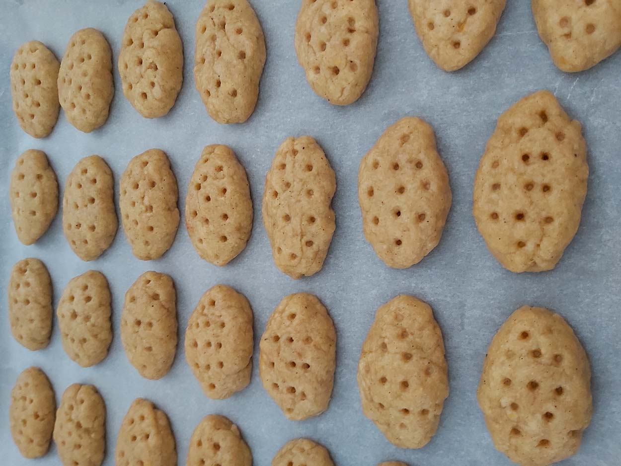 Πλάθουμε μπαλίτσες (27 γρ. η κάθε μία) σε σχήμα καρυδιού πιέζοντας ελαφρά από πάνω. Τοποθετούμε σε ταψί με λαδόκολλα.
