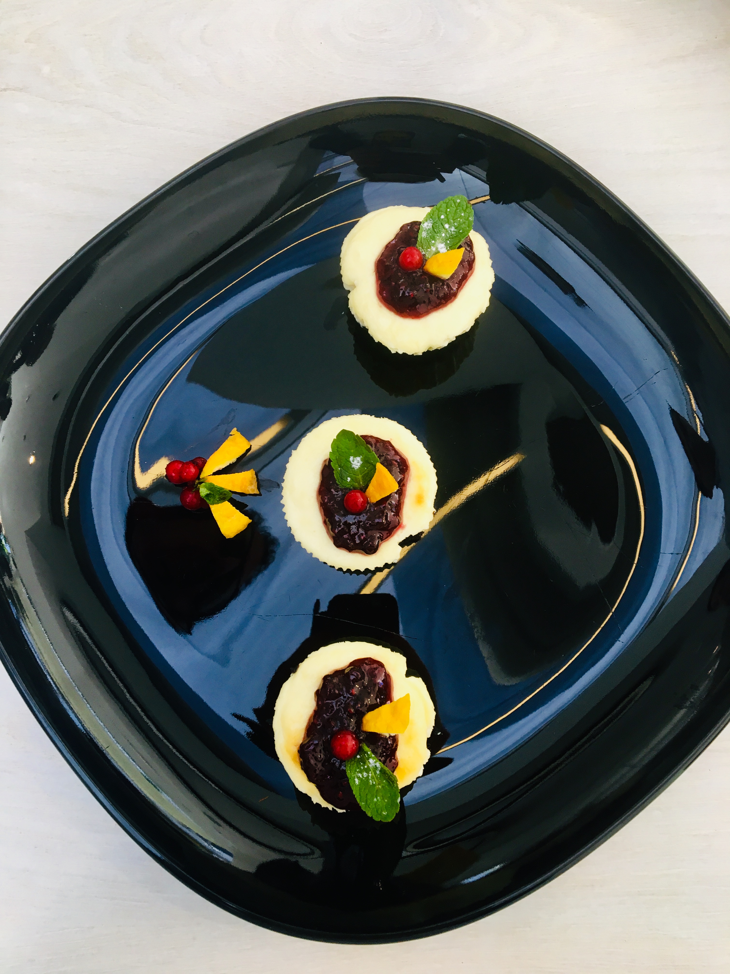 Στη συνέχεια, η φαντασία του Κωνσταντίνου Πετεβίνου μας ταξίδεψε… Με μαεστρία έφτιαξε ασπρόμαυρα τσιζκέικ φούρνου με λευκή σοκολάτα . Για το σερβίρισμα χρησιμοποίησε μαρμελάδα κόκκινων φρούτων, δημιουργώντας ένα εντυπωσιακό αποτέλεσμα.
