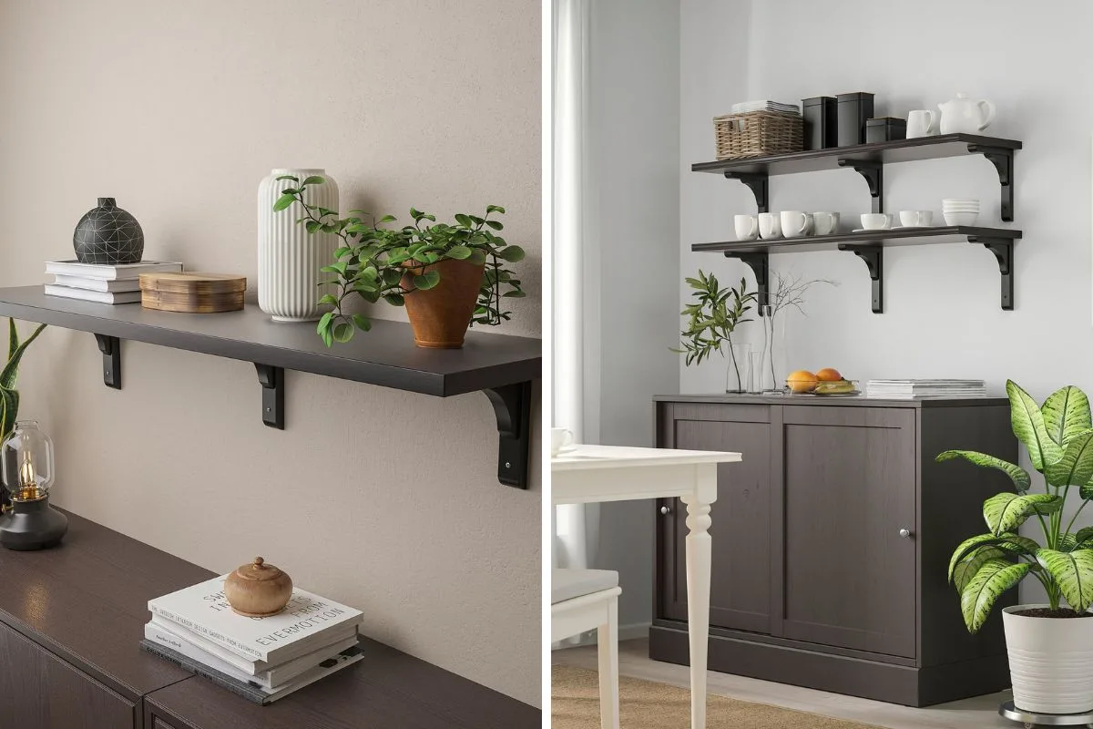 Τα ράφια είναι η πιο έξυπνη αξιοποίηση του χώρου, ειδικά σε μικρά καθιστικά. Χρησιμοποιούν τον τοίχο, δηλαδή μια επιφάνεια που συνήθως μένει ανεκμετάλλευτη και σου δίνουν χώρο για βιβλία, διακοσμητικά, καλάθια οργάνωσης, ακόμα και φυτά. Το μυστικό είναι να μην τα γεμίσεις μέχρι να… λυγίσουν. Λίγα και καλά. Και πάντα με έναν ρυθμό: κάτι ψηλό, κάτι χαμηλό, κάτι άδειο ανάμεσα, για να διατηρήσεις την καλαισθησία στον χώρο σου και να μην φαίνονται τα ράφια σου ως μια λύση έκτακτης ανάγκης.