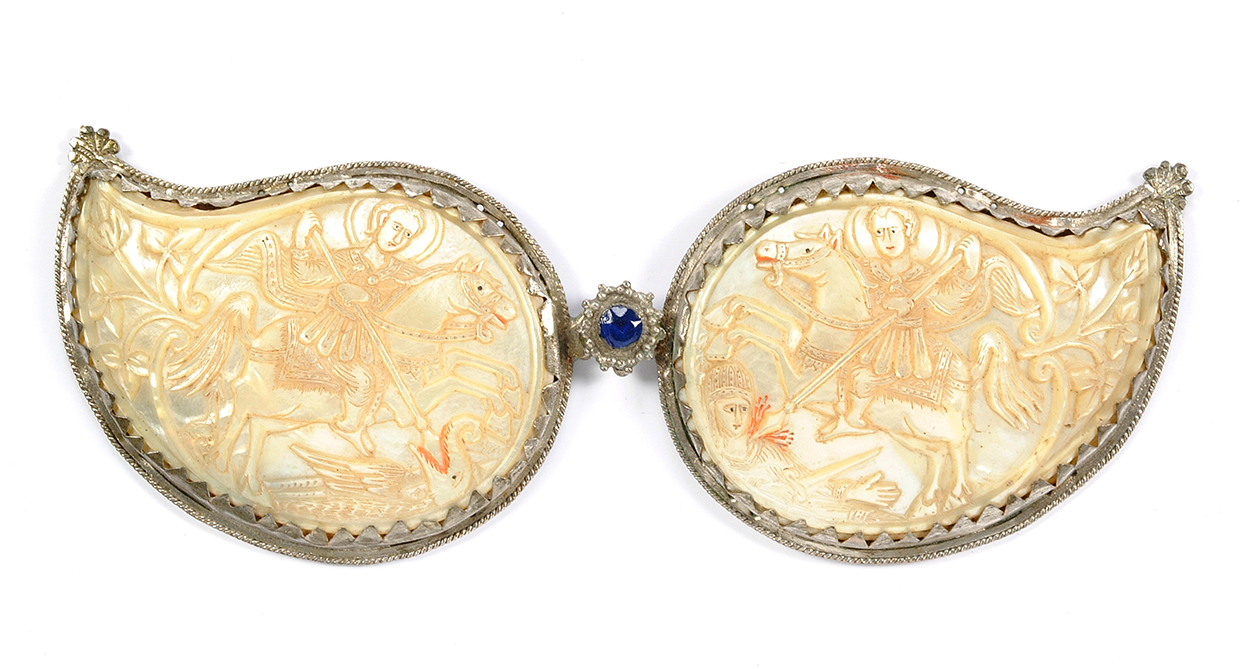 Πόρπη ζώνης του 18ου αιώνα, από σιντέφι με απεικονίσεις Αγίων. Χαρακτηριστικό εισηγμένο δείγμα στην Κύπρο από τους Αγίους Τόπους. Συλλογή: Ίδρυμα Α.Γ. Λεβέντη