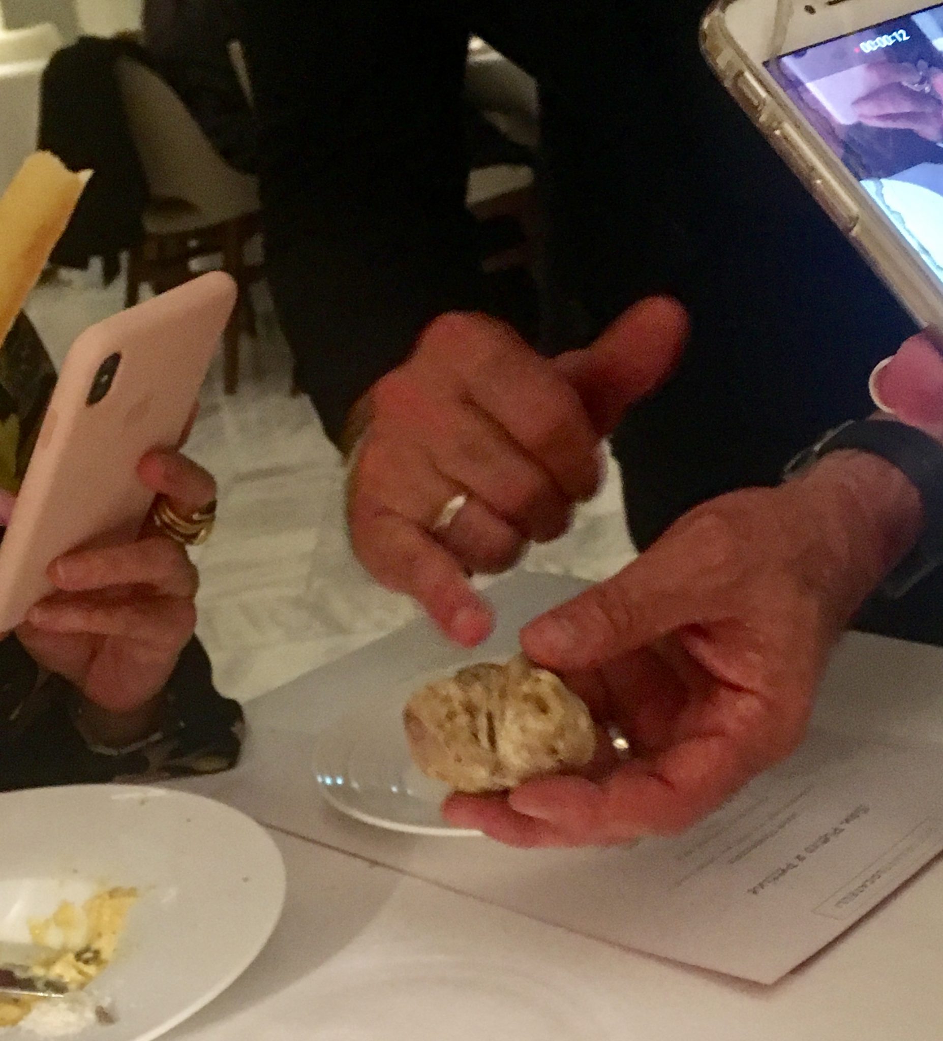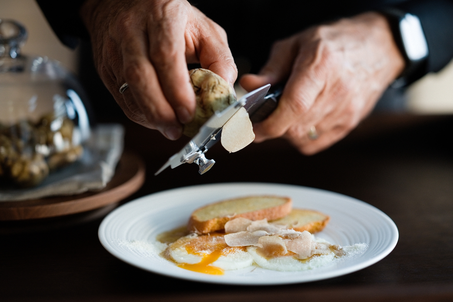 Και αφού μας μίλησε για την ιστορία του και την μονάδα επεξεργασίας της πολύτιμης τρούφας στην Ούμπρια της Ιταλίας, προχωρήσαμε στα ενδότερα του εστιατορίου… Ασφαλώς αδημονούσαμε να γευτούμε αυτό το τόσο ιδιαίτερο degustation μενού του… Με άκρατο επαγγελματισμό οι σερβιτόροι μάς πρόσφεραν το πρώτο πιάτο… Και τότε, είχαμε τη δεύτερη έκπληξη της βραδιάς… Ο Carlo Caporicci ήρθε στο τραπέζι μας κρατώντας το πολύτιμο υλικό και τον το ειδικό τρίφτη του… Κι άρχισε να πασπαλίζει τις καφετιές νιφάδες της λευκής τρούφας στα πιάτα μας.