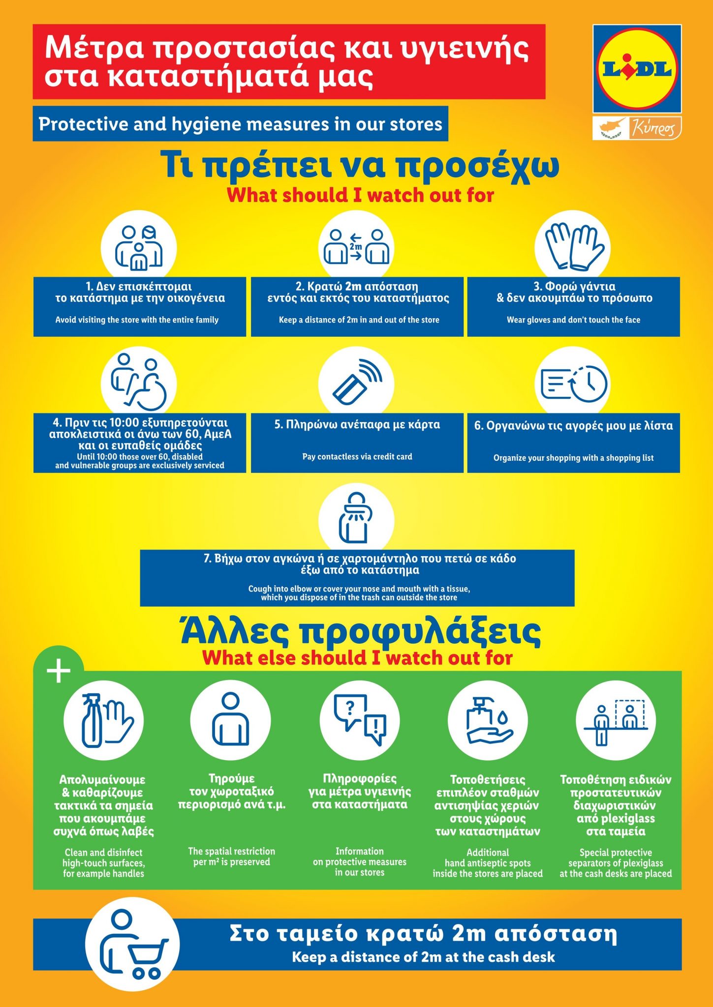 Στην κατεύθυνση αυτή, η Lidl Κύπρου εφάρμοσε έγκαιρα όλα τα απαραίτητα μέτρα. Παράλληλα, προχώρησε σε πρόσθετες πρωτοβουλίες για την προάσπιση της υγείας και ασφάλειας των εργαζομένων, των συνεργατών και των πελατών της.
