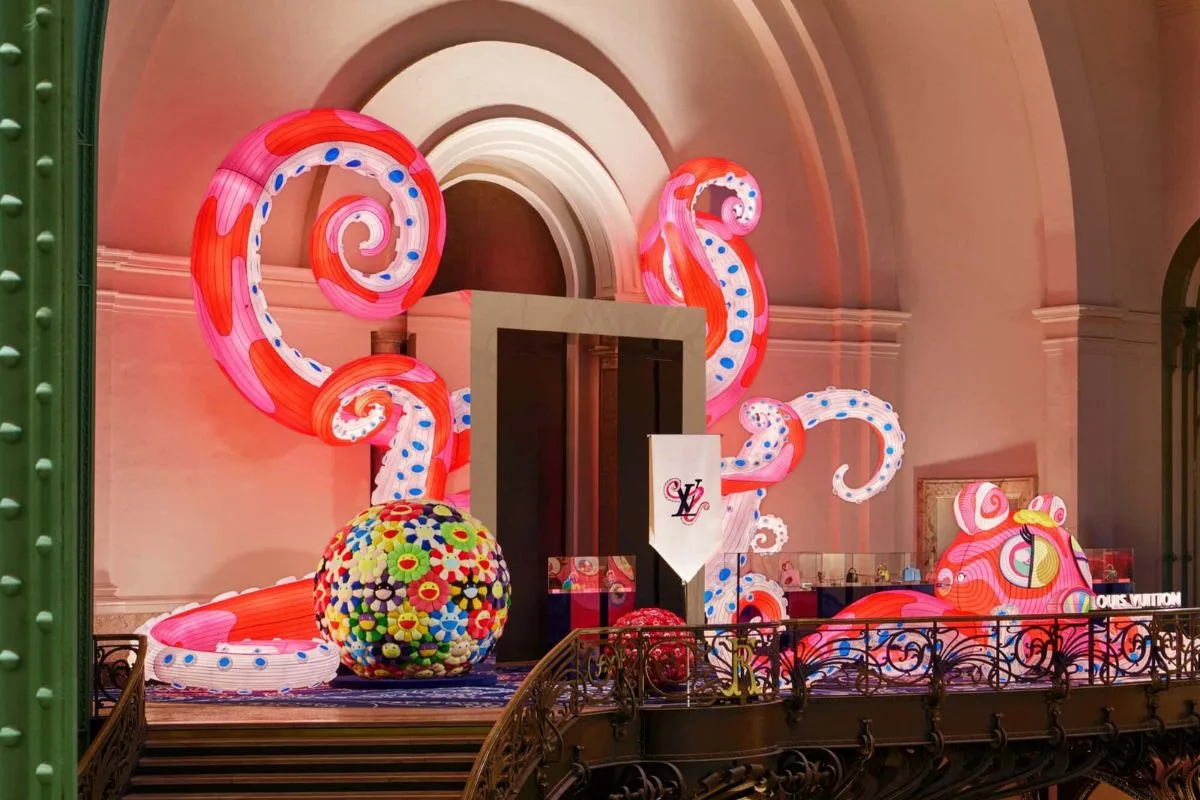 Στο Balcon d’Honneur του Grand Palais, δημιουργήθηκε μια εγκατάσταση που ξεπερνά την πραγματικότητα… Οι επισκέπτες αντικρίζουν ένα τεράστιο γλυπτό χταπόδι, εμπνευσμένο από τα κινεζικά φαναράκια – μια δημιουργία που ισορροπεί ανάμεσα στη φαντασία και τη μηχανική ακρίβεια. Τα πλοκάμια του χταποδιού απλώνονται στον χώρο, “αγκαλιάζοντας” τις τσάντες Capucines και οδηγώντας το κοινό στο σουρεαλιστικό σύμπαν του Takashi Murakami. Μιλάμε για μια εμπειρία που θυμίζει ονειρικό σκηνικό… Ένα χαλί με μοτίβα εμπνευσμένα από το γλυπτό επεκτείνει την εμπειρία, ενώ οι σκηνογραφικές λεπτομέρειες και τα λούτρινα γλυπτά προσθέτουν μια απροσδόκητη, παιχνιδιάρικη τρυφερότητα. Ένα ταξίδι ανάμεσα στην ποπ κουλτούρα του καλλιτέχνη και την υψηλή ραπτική του γαλλικού οίκου.