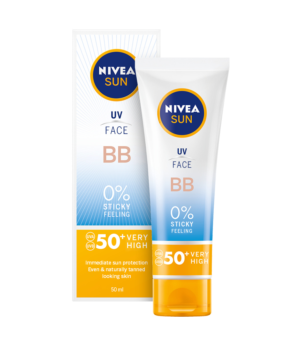 UV Face BB, SPF 50, NIVEA SUN, υψηλή προστασία και κάλυψη δυσχρωμιών, με διακριτικό χρώμα που χαρίζει όψη φυσικού, ομοιόμορφου μαυρίσματος.