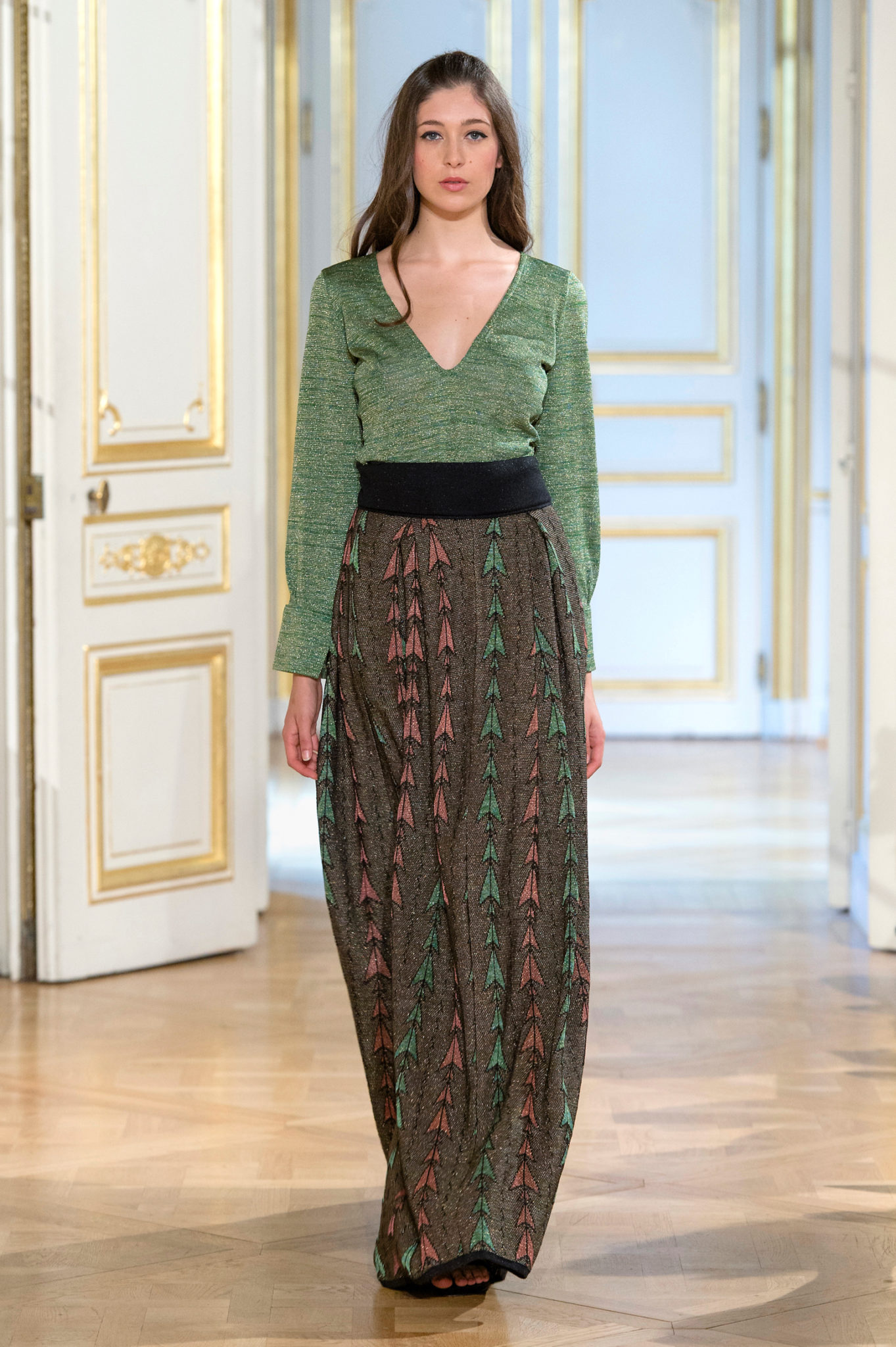 Της αρέσει να παίζει με τα χρώματα, αλλά φέτος πρωταγωνιστές της είναι το μαύρο και το χρυσό, οι αποχρώσεις του φωτός και του σκότους, το πράσινο, το μωβ, το σομόν, το blue black και το κόκκινο, που δημιουργούν μια γιορτή πολυτέλειας από πλεκτά υφάσματα με κομψά σχέδια, που αγκαλιάζουν τις γυναικείες φιγούρες. Τα υφάσματά της διακρίνονται για τις πλέξεις τους, που κάνουν τις δημιουργίες της ακόμη πιο ενδιαφέρουσες.