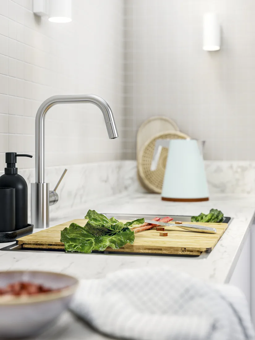 Όσο για τον πάγκο; Δεν χρειάζεται να παρακαλάς να μεγαλώσει. Βάλε έναν μεγάλο δίσκο κοπής πάνω από τον νεροχύτη και θα έχεις αμέσως έξτρα επιφάνεια εργασίας! Το καλύτερο; Το καφέ του ξύλου κάνει αντίθεση με το λευκό της κουζίνας και το αποτέλεσμα το λες και chef’s kiss!