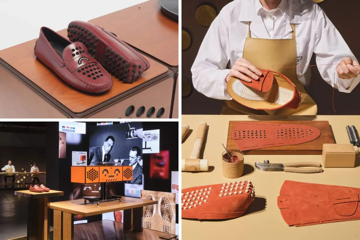 Τα αυθεντικά αντικείμενα παρουσιάζονται δίπλα στις επανερμηνείες του loafer, δημιουργώντας έναν διάλογο ανάμεσα στο βιομηχανικό design και τη δεξιοτεχνία της ιταλικής υποδηματοποιίας. Παράλληλα, τεχνίτες της Tod’s επιδεικνύουν τη χειροποίητη διαδικασία ραφής που παραμένει στο επίκεντρο της ταυτότητας του brand.